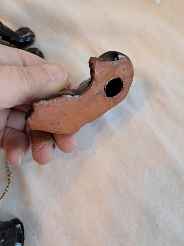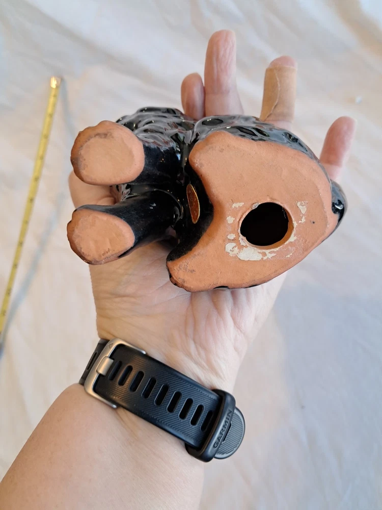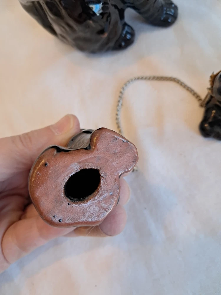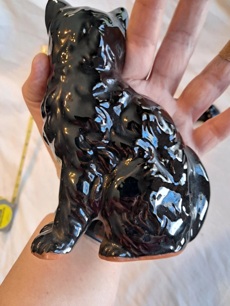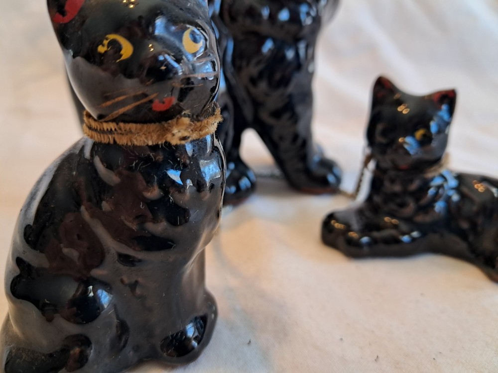Vintage ARTMARK Black Ceramic Cat Family Figurine Set A wonderful, collectible mid-century black ceramic cat family imported by Artmark. This listing includes three pieces —one large 6-inch adult cat and two smaller kittens connected by a chain. Configuration Note: The chain is currently only attached to the two kittens. It is highly probable that the chain originally connected to a collar on the main cat, which has since deteriorated a common occurrence for these vintage sets. The three cats are meant to be displayed together as a family group. Key Details: Brand: Artmark (Artmark Chicago) Pieces: Set of 3 figurines (Large cat & 2 chained kittens). Era: Mid-Century Modern (MCM), likely 1950s-1960s. Markings: Original red and gold diamond-shaped Artmark sticker on the base of the large cat. Material: High-gloss black glazed ceramic over an unglazed reddish clay base ( terracotta/redware ). Condition: Excellent vintage condition. No chips, cracks, or repairs. The chain on the kittens is intact. The small collars on the kittens show minor deterioration consistent with age. Size: Large cat measures approximately 6 inches tall.