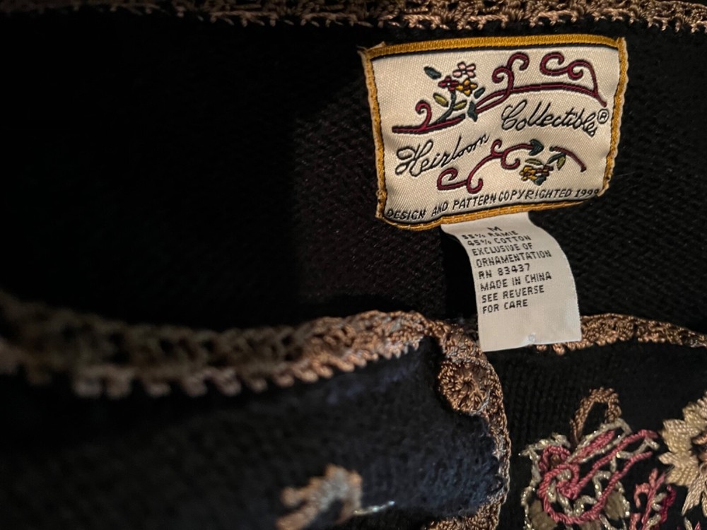 gtin13: n/a Style: Cardigan Sleeve Length: 3/4 to l/s Size Type: Regular Seller Notes: “Very nice” Color: black & multi Brand: Heirloom Collections Features: All Seasons, Collarless, Button front Type: Sweater UPC: n/a Country/Region of Manufacture: China Department: Women Size: M Garment Care: Hand Wash Only Knit Style: Tight-Knit Fabric Type: Knit Material: Cotton, Ramie Neckline: wide neck opening Accents: needlework, beads, faux pearls Vintage: Yes