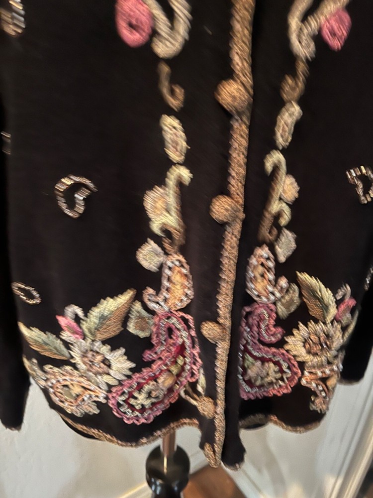 From a 1999 design Heirloom Collections cardigan in ramie and cotton. Black tight knit and floral/paisley needlework with faux pearls and beads. Knit trim in greens around the neck opening and green knit covered buttons. Many muted colors but the main one is green in several shades. All over front and upper sleeves with paisley floral and silver. Almost 24 long, sleeves 19 to dropped shoulder seams. Across the chest when buttoned at underarm level 21 and about 20 across the bottom in front.