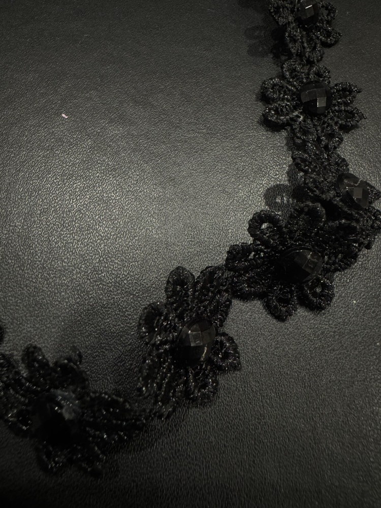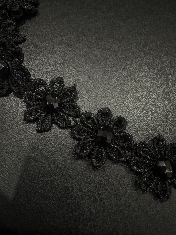 Elevate your outfit with this vintage black lace and stone intricate choker. Perfect for adding a touch of elegance and edge to any look, this choker features a unique design that is sure to make a statement. The intricate details of the lace and stone combination create a stunning piece of jewellery that is both versatile and stylish. Ideal for those who appreciate vintage-inspired accessories, this choker is a must-have for any fashion-forward individual looking to elevate their style game.