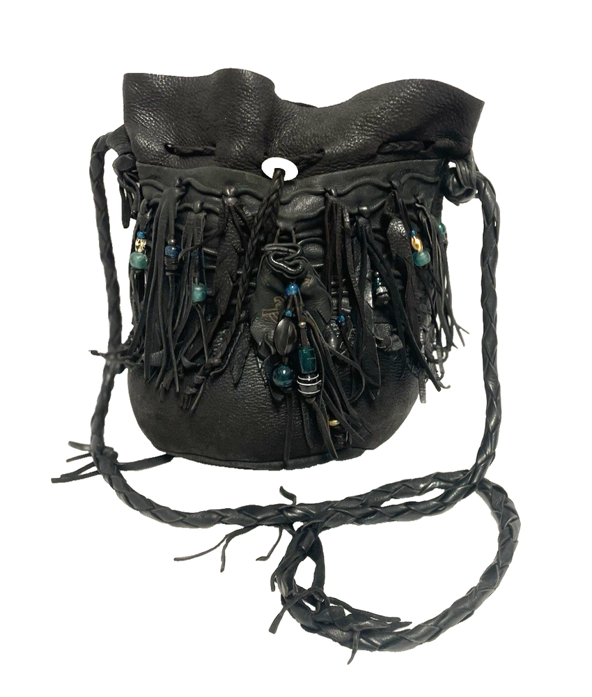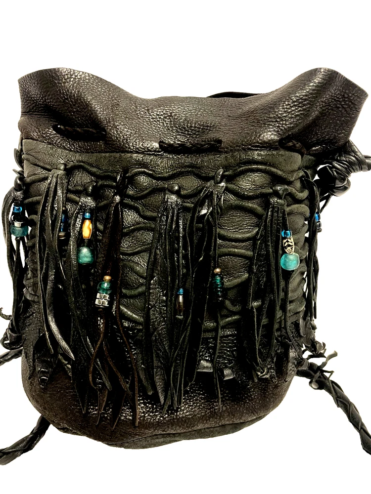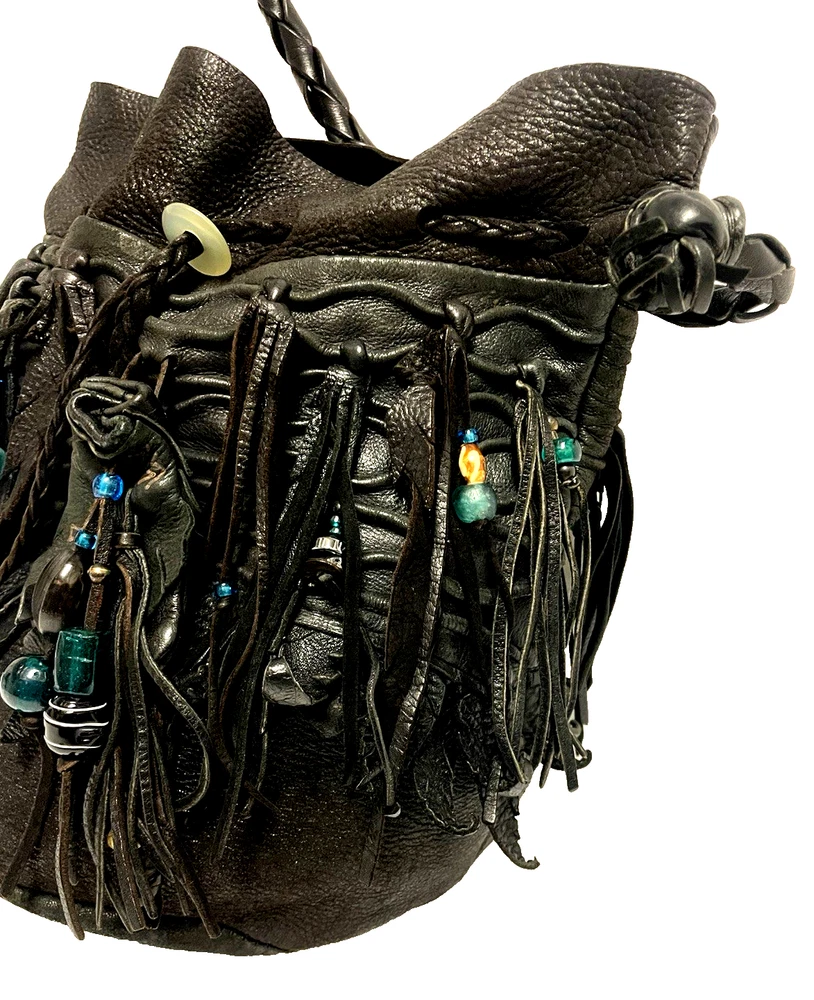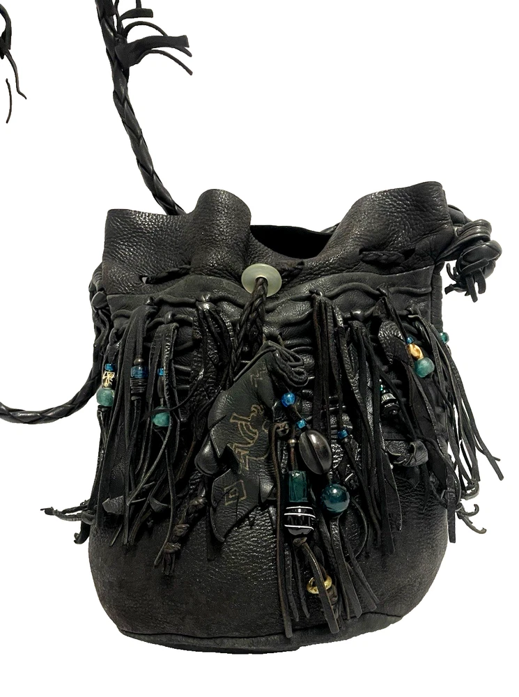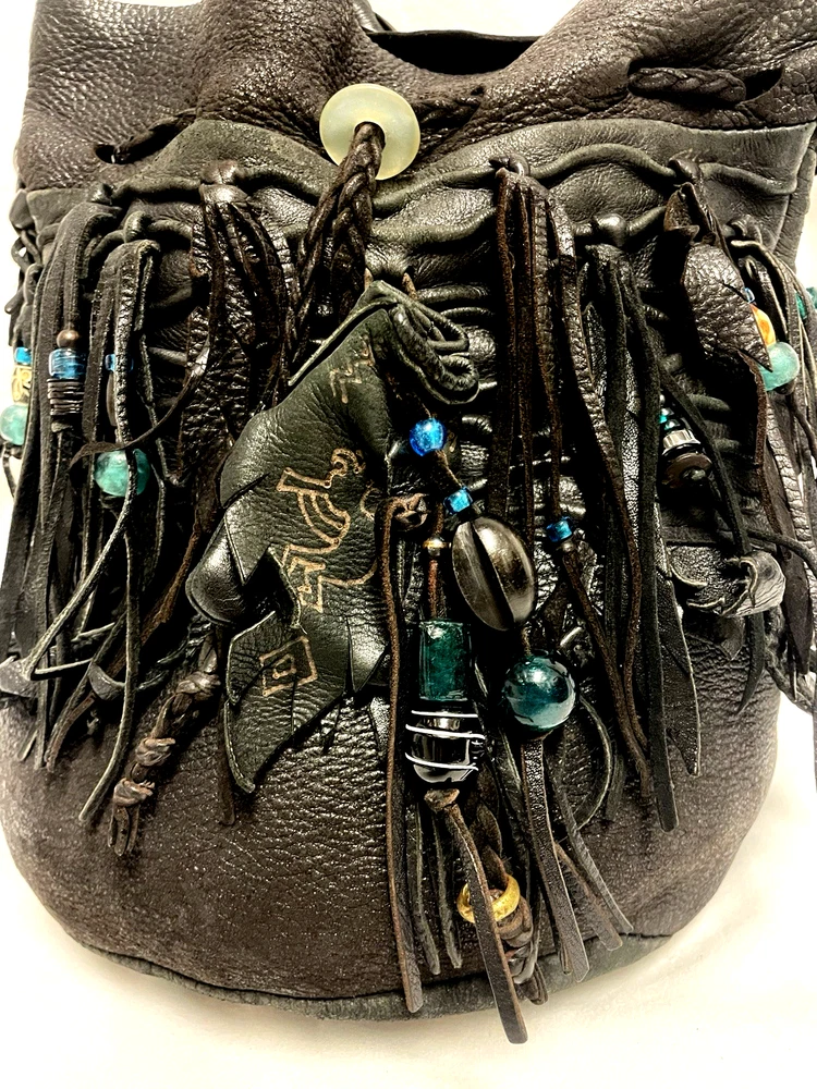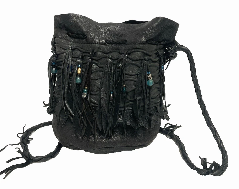 This black lambskin shoulder bag features a unique Kokopelli design with glass bead accents. The pebbled handcrafted exterior, combined with the adjustable lambskin strap, adds a touch of luxury and sophistication to the bag. With a drawstring closure and ample storage space, this bag is both functional and fashionable for any outfit or occasion. Perfect for women who appreciate quality craftsmanship and attention to detail in their accessories. This bag is both unique and beautifully handcrafted!