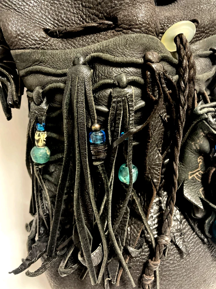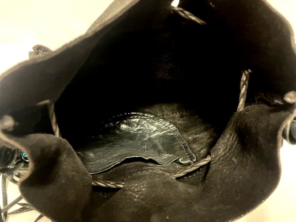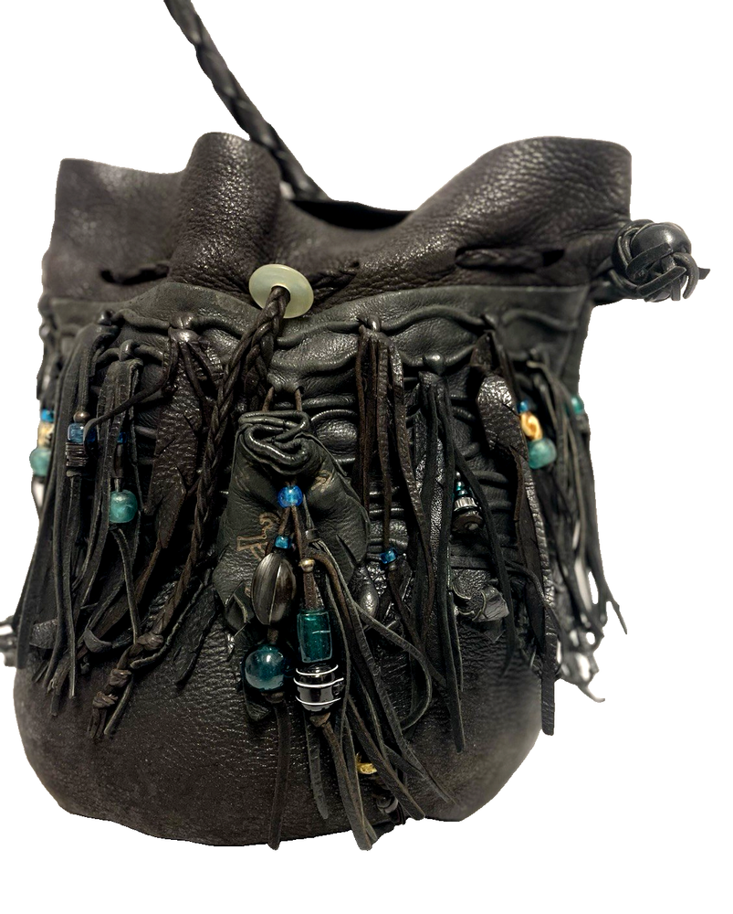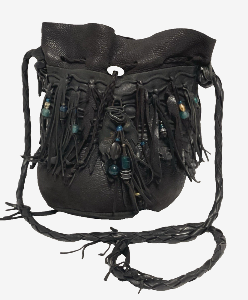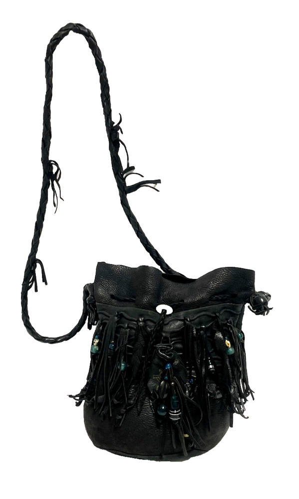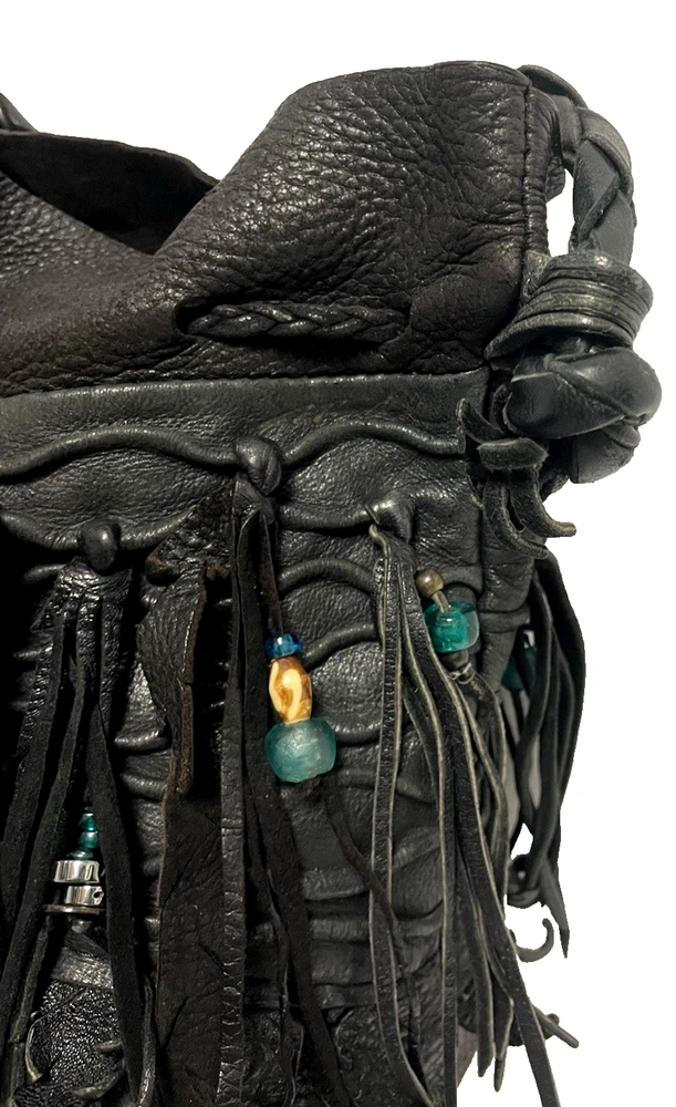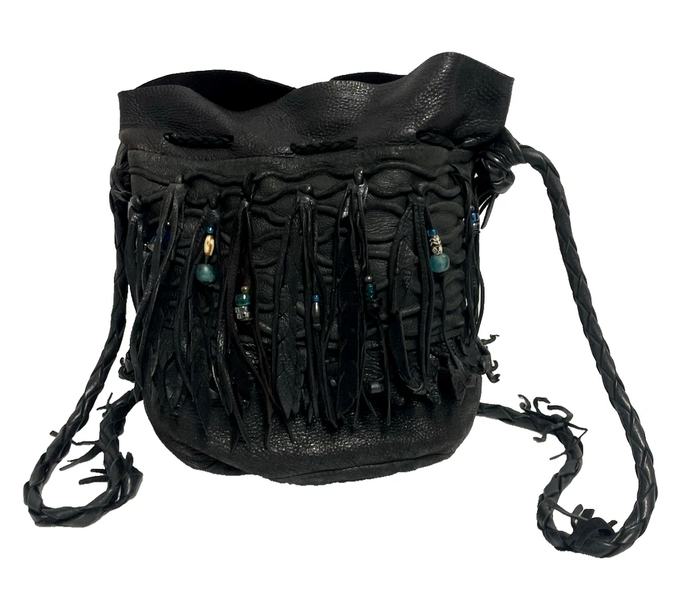 This black lambskin shoulder bag features a unique Kokopelli design with glass bead accents. The pebbled handcrafted exterior, combined with the adjustable lambskin strap, adds a touch of luxury and sophistication to the bag. With a drawstring closure and ample storage space, this bag is both functional and fashionable for any outfit or occasion. Perfect for women who appreciate quality craftsmanship and attention to detail in their accessories. This bag is both unique and beautifully handcrafted!