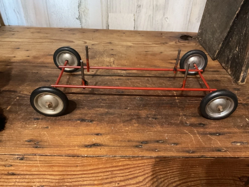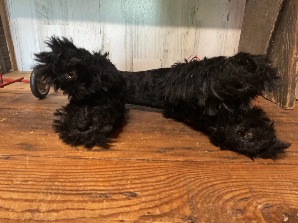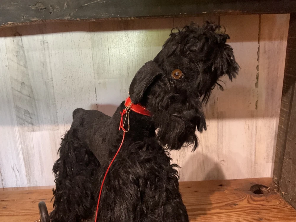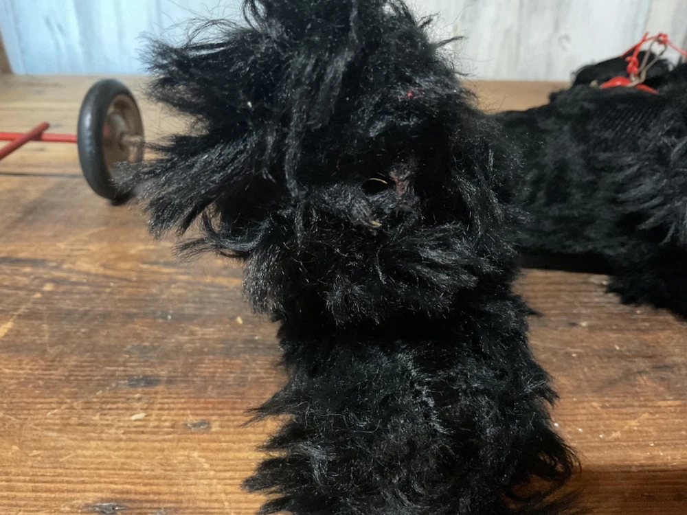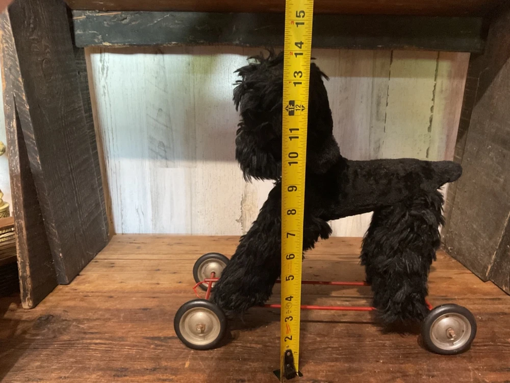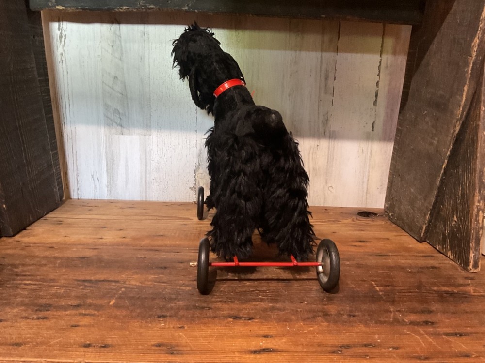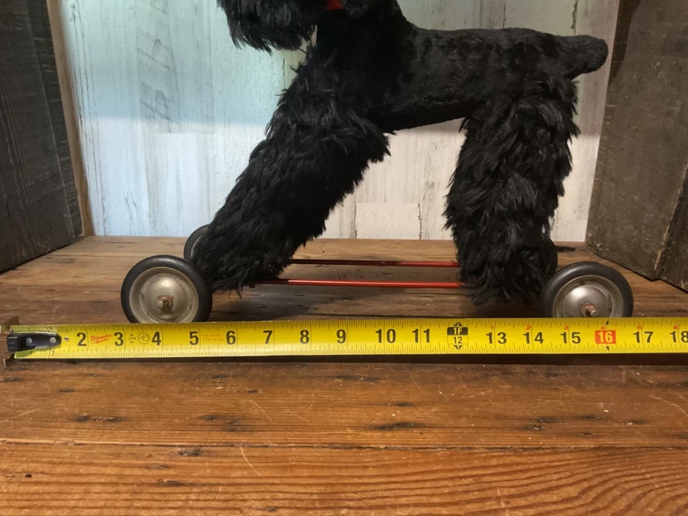 Unbranded stuffed dog on wheel base, push/pull along toy. I believe the dog is straw stuffed with a red collar and red vinyl pull along string. Super cute vintage toy. Measures 14 1/2” tall to top of dog head when on wheels and 14 1/2” wide from front wheel to back wheel. Note, when shipping will take the dog off the wheel base and wrap wheel base well to avoid it damaging the stuffed dog. Items are being purchased as noted in description in addition to pictures, so please take note of both. I appreciate prompt payment within 3 days of winning bid/purchase and will ship items within 3 business days upon receipt of payment. Please view shipping method as I typically ship USPS, most cost effective route, unless noted otherwise or a second shipping option is included/selected. No refunds are made due to an item arriving as shown in pictures and in description.