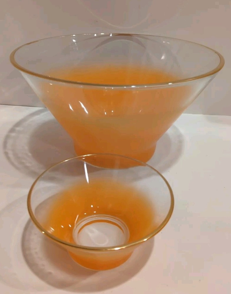 Usually when I happen upon these gorgeous frosted glass Blendo bowls, they've gone through the dishwasher or been so beat up, the color and gold rim are really scratched. Not the case with this orange chip and dip set! Yes, there's a little wear, but the color and rim are in great shape as seen in the pictures. The chip bowl measures about 11 inches across and the dip bowl measures about 5 inches. Sadly, the accompanying bracket could not be located, but your friends will be just as impressed with them sitting side by side!