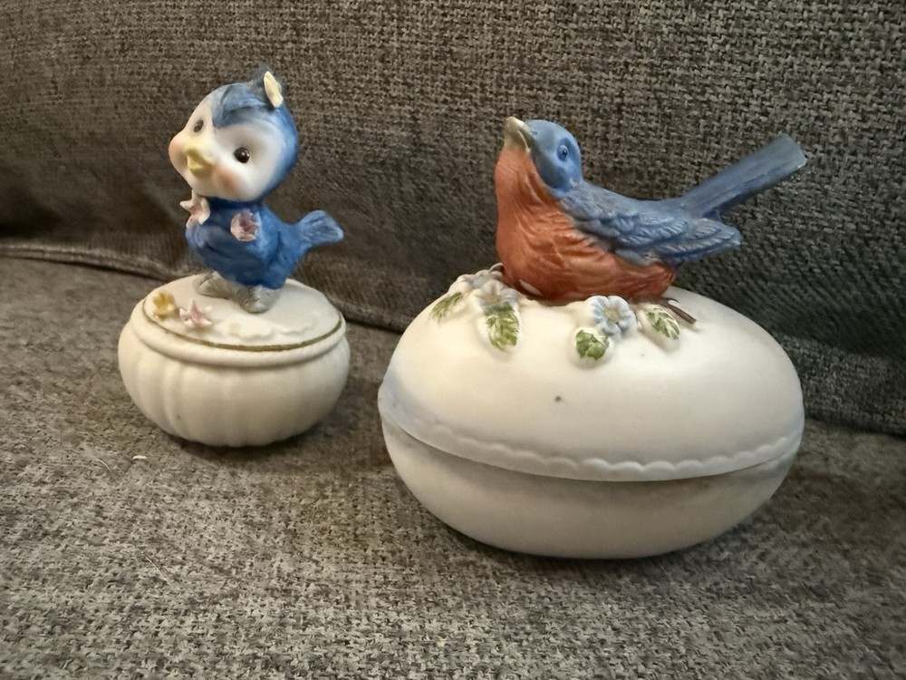 This Vintage Ceramic Blue Bird Trinket Boxes Set of 2 features an oval shape with a retro style, adorned with a floral pattern and a matte finish. Each medium-sized box is designed with a charming blue bird motif, making them perfect for all occasions. Made of ceramic in Taiwan during the late 20th century, these trinket boxes come boxed and are ideal for collectors of decorative items.
