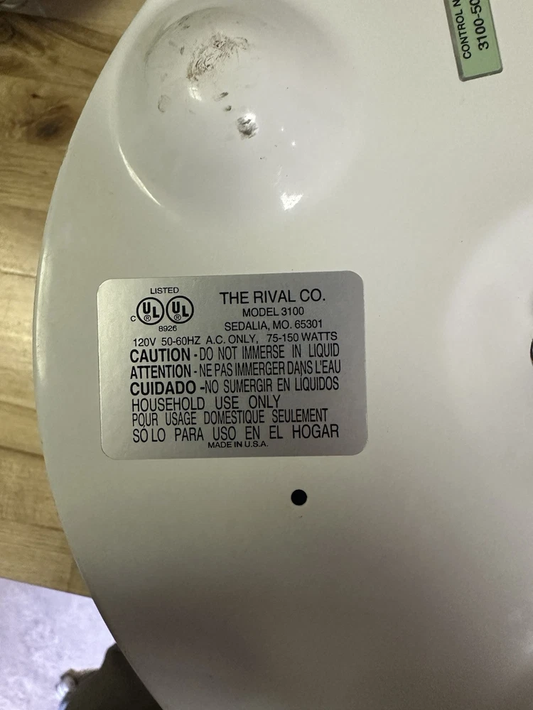 Power Source: Electric Brand: Rival Features: Easy Clean, Portable Capacity: 3.5 qt Number of Settings/Programs: 2 Type: Slow Cooker Components Included: Base, Lid, Pot Model: Rival 3100 Power: 150 W Color: Multicolor MPN: 3100 Material: Stoneware