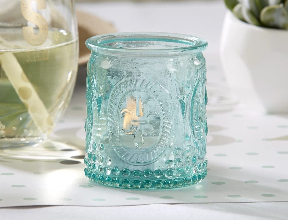 Love is in the air, so ignite it for all to see. Vintage-inspired embossed candle holders create a beautiful glow when illuminated from within. Features and facts: Reminiscent of heirloom-quality, embossed, aqua colored glass. Sold in sets of 4, tea lights not included. Measures 2.75"height x 2.15" width. BEAUTIFUL & FUNCTIONAL The blue glass Votive Candle Holder features a fleur de lis design around the outside of the glass and is sold in a set of 4 and wrapped securely in bubble wrap and shipped in a white box. This vintage glass candle holder from comes in a set of four to serve as a centerpiece and also makes a great favor container for your guests. Enhance your home decor with a classic decoration that can be filled with anything from candies to small gifts. HOME DECOR/SHELF DECOR - These vintage Blue Glass Tea Light holders are perfect for your fall events or just for around the home. The set of 4 features a fleur de lis design around the outside of each votive. These can be used on a long plate as a centerpiece or separate them out. These are the perfect neutral color that will create a warm and cozy ambiance. DECORATIVE - From room decor on shelves, in the living room, kitchen, bathroom or tables, these farmouse inspired vintage styled votive candle holders are the perfect home decor for anywhere in your house! DECORATIVE LANTERNS - The Glass Candle holders are a great way to add a little ambience to any room or shelf. Drop in a tealight or votive candle (not included) or fill with flowers, herbs or candy. Not only are they great as tealight candle holders, but you can also use them for office supplies, flowers, plants and so much more! Product measures: 2.32" w x 2.756" h x 2.32" d. Packaged product measures 5.039" w x 2.953" h x 5.039" d.
