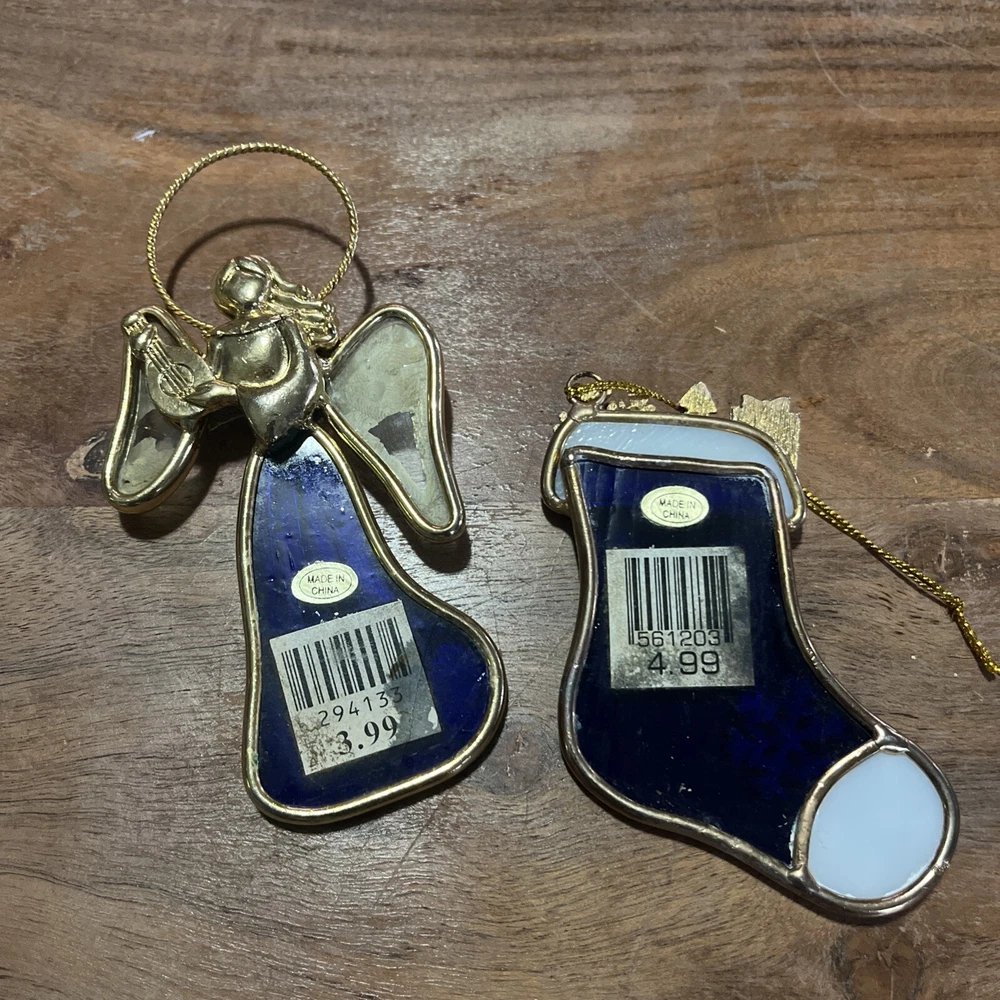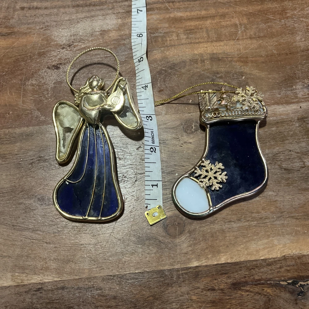 Add a touch of vintage charm to your Christmas decor with this beautiful blue stained glass angel ornament. The intricate design and delicate details make it a perfect addition to any holiday collection. The angel is holding a stocking in its hand and is sure to be a conversation starter. Crafted with care, this ornament is made of glass and features a sun catcher design. It is perfect for any occasion, but especially suitable for Christmas. This set includes two items, and both are adorned with the vintage brand name. Don't miss out on adding this unique and beautiful piece to your collection.