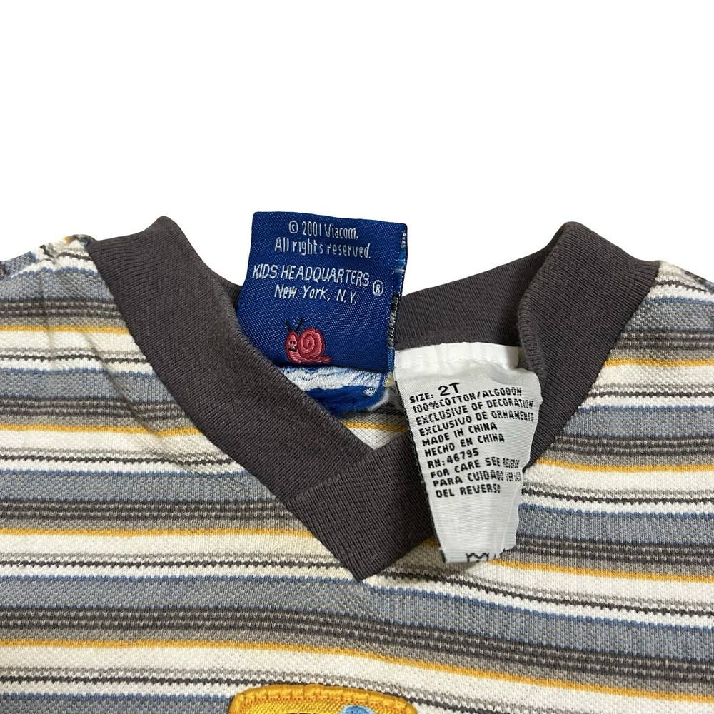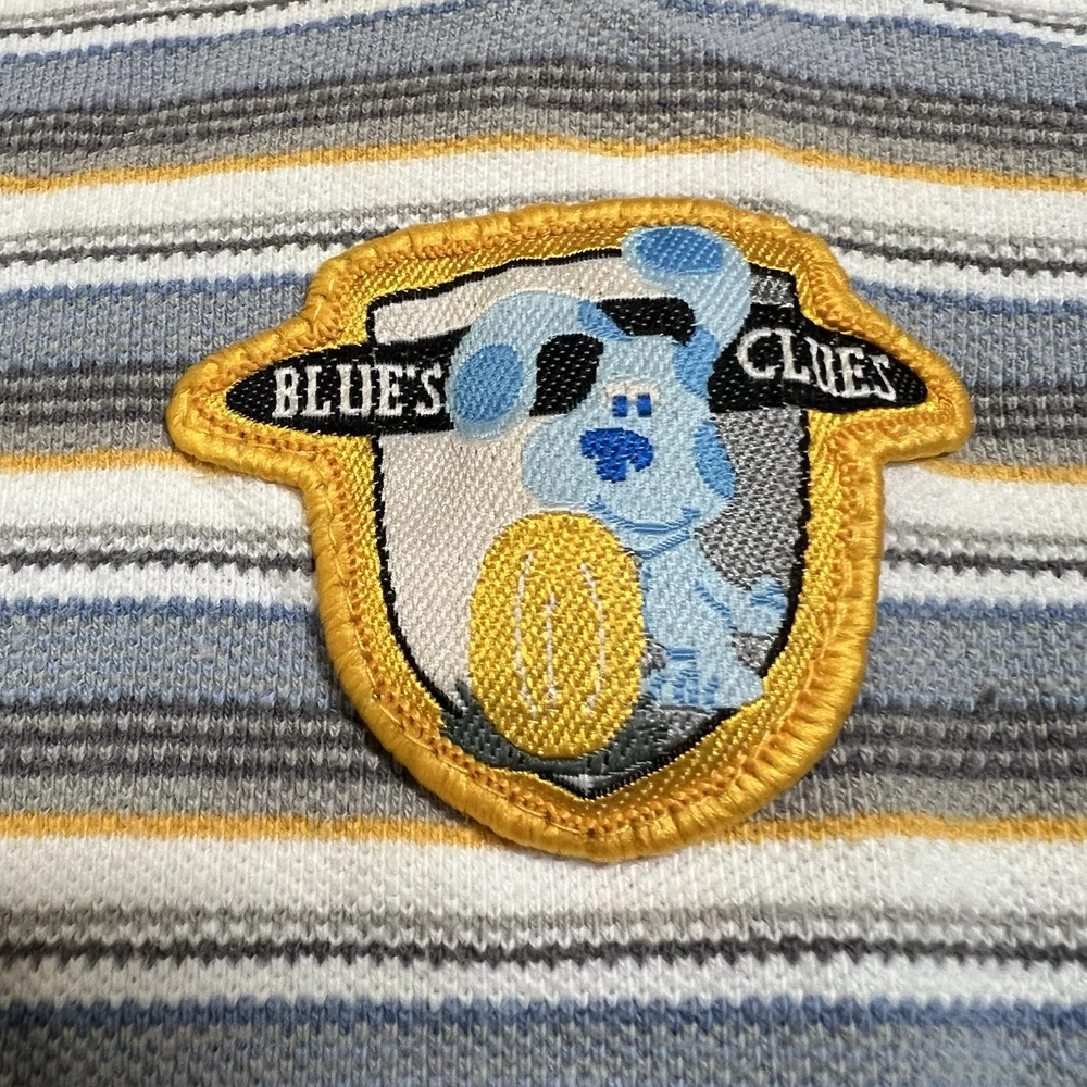 Brand: Blues Clues, officially licensed Blue's Clues apparel by Kids Headquarters. Size: Boys 2T (toddler) per neck tag. Color: Multicolor horizontal stripes in gray, white, light blue, and yellow with a dark charcoal ribbed collar. Material: 100% cotton knit body exclusive of decoration per fabric tag. Style: Vintage boys short sleeve crew neck T-shirt with regular fit and classic striped pattern. Details: Embroidered Blue's Clues shield patch at chest featuring Blue the dog, small woven paw logo tab at hem, contrast ribbed neckline, straight hem, and soft all-season cotton jersey fabric. Brand markings: Blue's Clues character neck label, Kids Headquarters New York N.Y. licensing tag with 2001 Viacom copyright, inner care and content tag with RN 46725. Country of origin: Made in China. Condition: Pre-owned shirt in clean shape with light wash wear to cotton knit and a small loose thread at one hem seam; fabric, embroidery, and seams intact with no stains, holes, or tears.