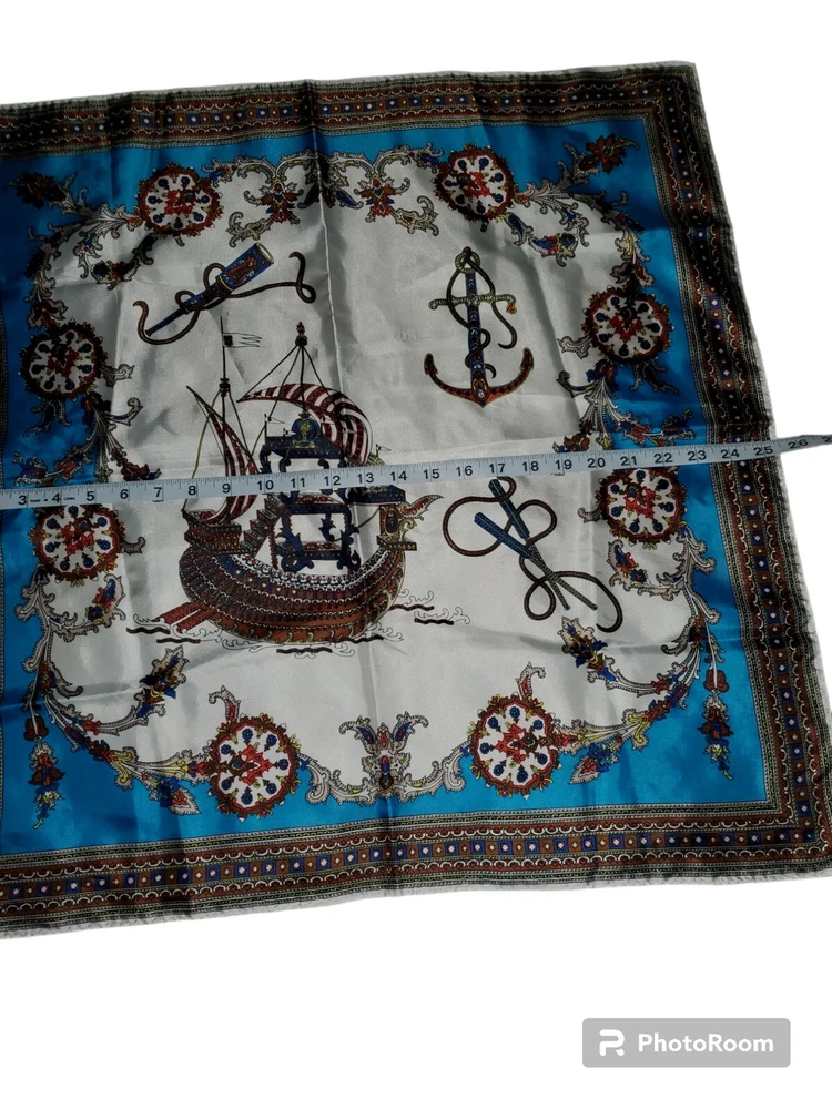 Add a touch of vintage nautical charm to your wardrobe with this 26 inch square scarf in a multi-color polyester material. Perfect for beach-goers and boating enthusiasts alike, this scarf features a nautical-themed pattern that will have you feeling like you're sailing on the high seas. Hand wash only to keep this scarf in top condition for years to come. With its versatility, this scarf can be used as a neck warmer, head cover, or even as a wall hanging to add some coastal flair to your home decor. This vintage scarf is a must-have for any fashion-forward individual who loves all things nautical.