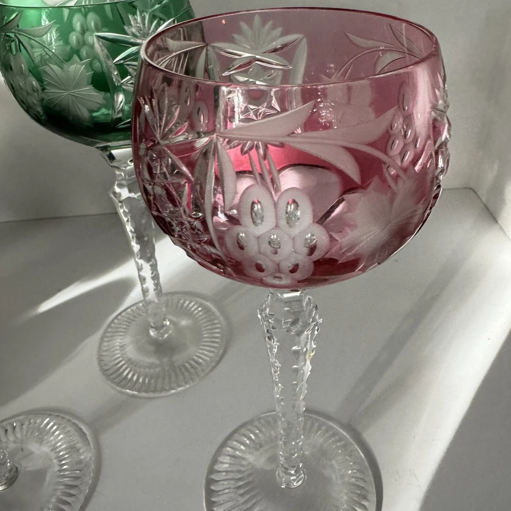 Title: Vintage Bohemian Crystal Wine Glasses Set of 3 - Multicolor Cut-to-Clear Stemware (Green, Pink, Purple) Description: Enhance your glassware collection with this exquisite set of three vintage Bohemian crystal wine glasses. Each glass features a stunning cut-to-clear design in vibrant green, pink, and purple, showcasing intricate patterns and craftsmanship. These glasses have beautifully detailed stems and bases, adding elegance and sophistication to any table setting. • Color: Green, Pink, Purple • Material: Genuine Bohemian crystal • Style: Cut-to-clear, vintage • Dimensions: Approximately 7-8 inches tall (see images with ruler for reference) • Condition: Excellent vintage condition, with no visible chips or cracks. These glasses have been well-preserved and are perfect for display or use. This set is perfect for collectors of fine glassware or those who appreciate the charm of vintage crystal. These glasses also make an ideal gift for special occasions such as weddings, anniversaries, or housewarmings. Keywords: Bohemian crystal, vintage glassware, cut-to-clear, wine glasses, colored glass, stemware, crystal goblets, European crystal, collectible glass, vintage barware Shipping: Carefully packaged to ensure safe delivery. Fast shipping available within the continental USA. Add a touch of vintage elegance to your home with these beautiful Bohemian crystal wine glasses! Thank you for visiting my store- please check it all my fabulous treasures. I list new pieces daily. If you are a returning customer please let me know as i love to reward repeat buyers with special coupons and treats xoxoxox