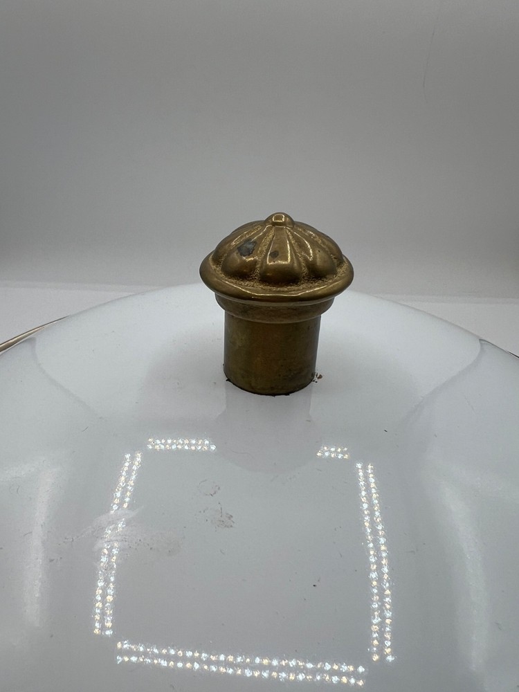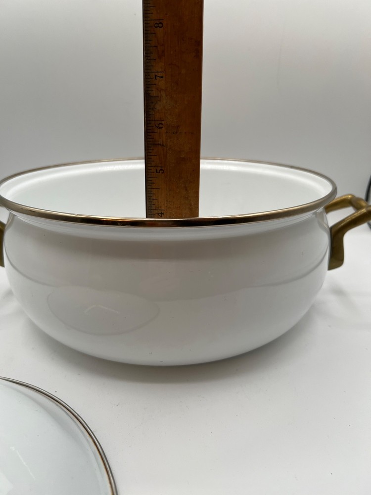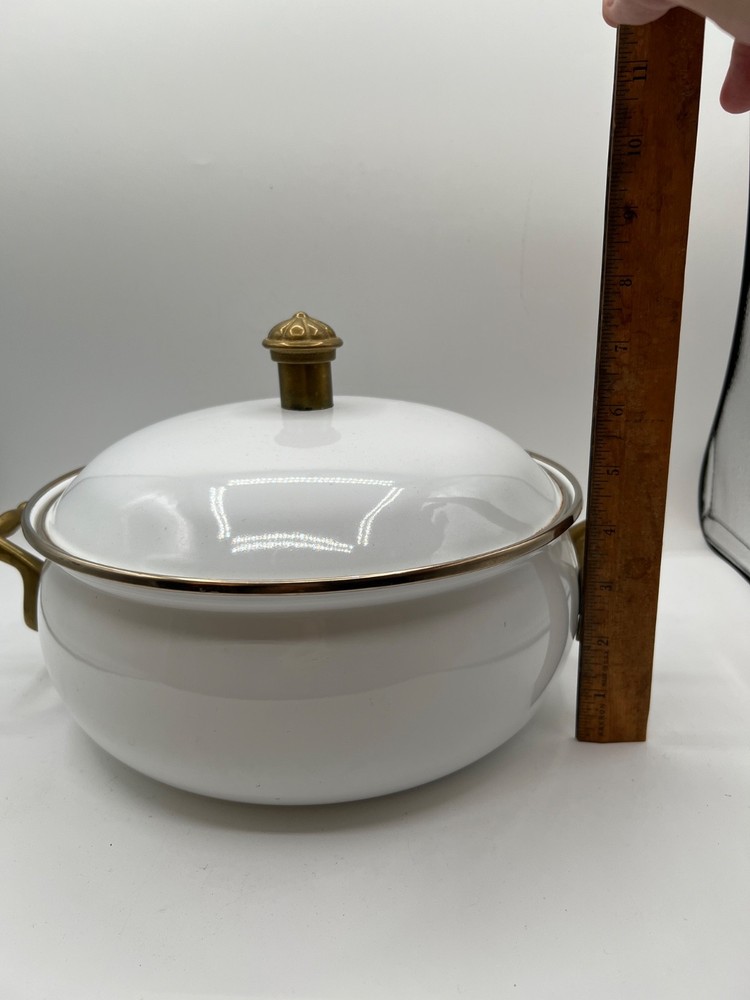 The product is a vintage Bon Chef white enamel Dutch oven with brass handles, designed for use on induction, electric, and gas stoves. This two-piece set includes a lid and has a capacity of 5 quarts. The round Dutch oven has a diameter of 8 inches, a depth of 4 1/2 inches, and weighs 4 lbs 15 ozs. Made of enamel, this collectible cookware piece is original and features a classic design that is perfect for cooking on both gas and electric ovens.
