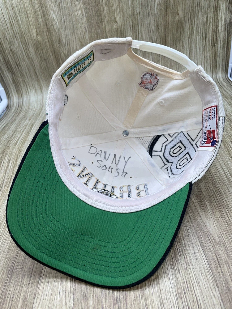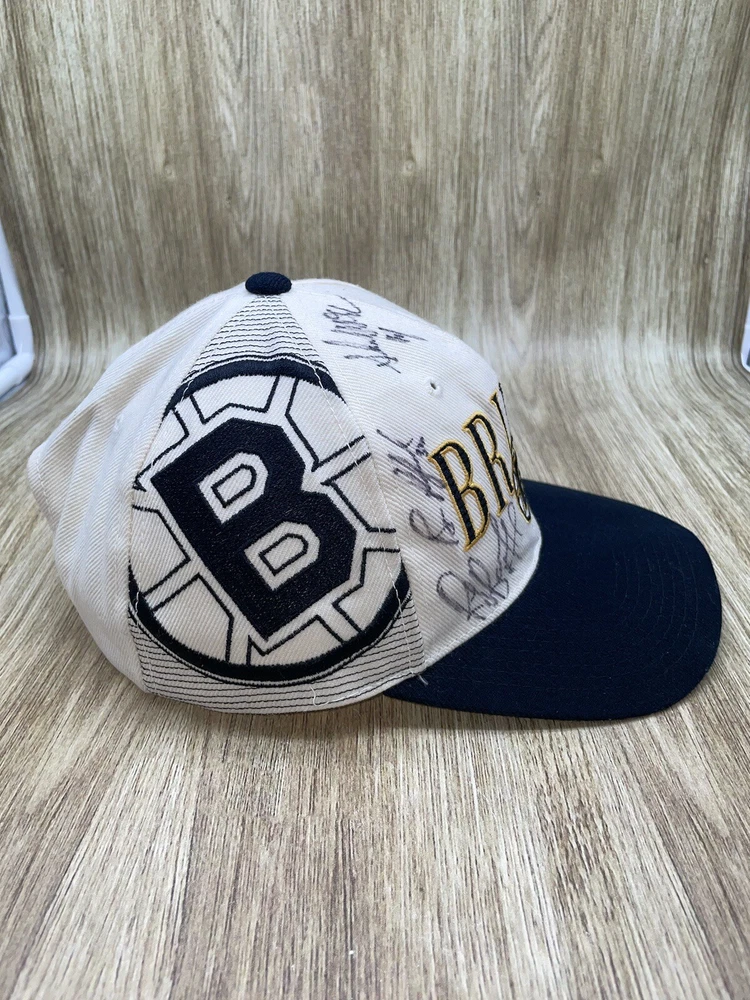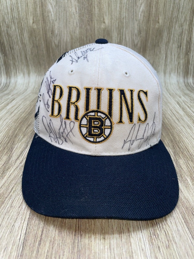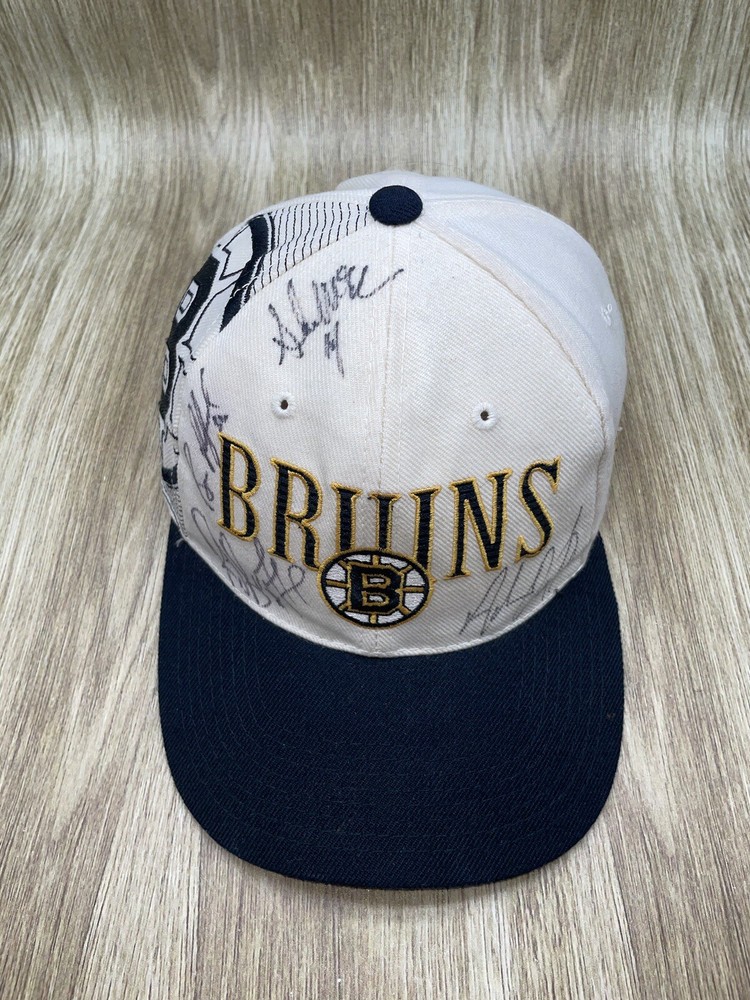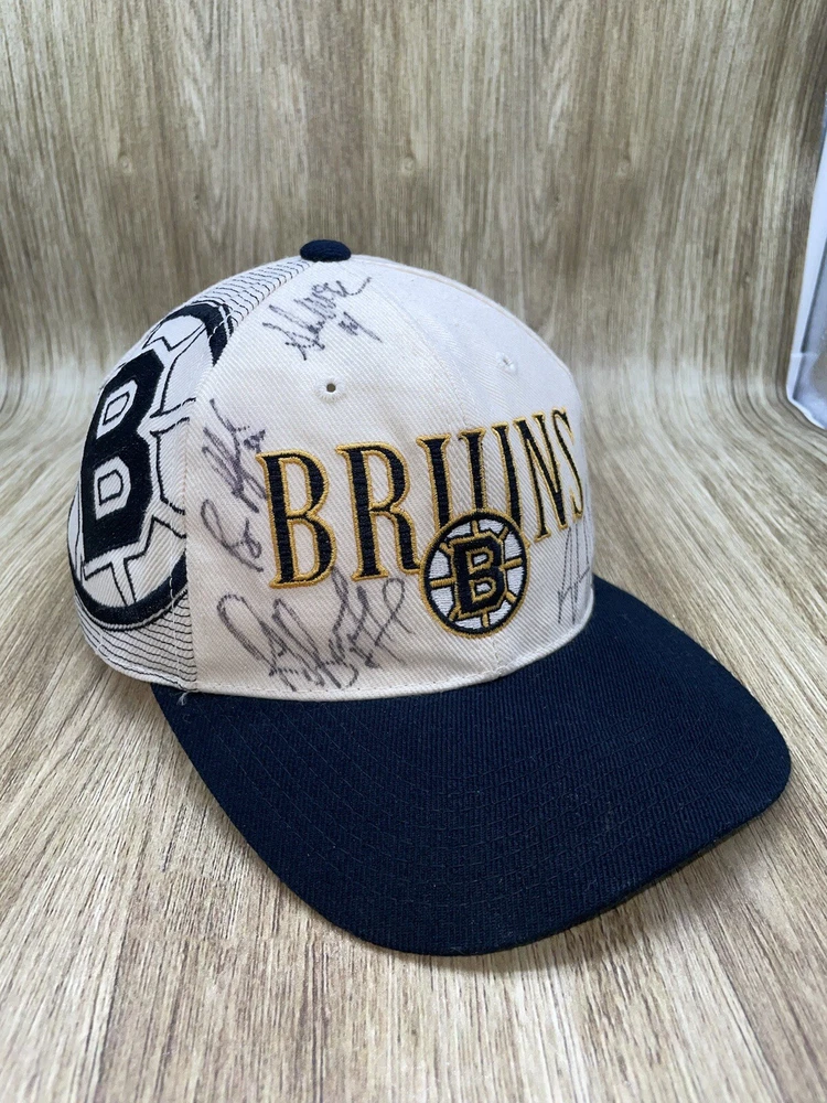 Nice hat autographed not sure on the players shipped secure box The product is a vintage Boston Bruins Sports Specialties snapback hat that is officially licensed by the National Hockey League (NHL). It features the team's colors and logo, making it a great item for fans to show their support. The hat is autographed, adding to its collectible value and appeal to fans looking for unique memorabilia from the Boston Bruins. Made in Bangladesh, this unisex adult-sized cap is a perfect addition to any hockey fan's collection.