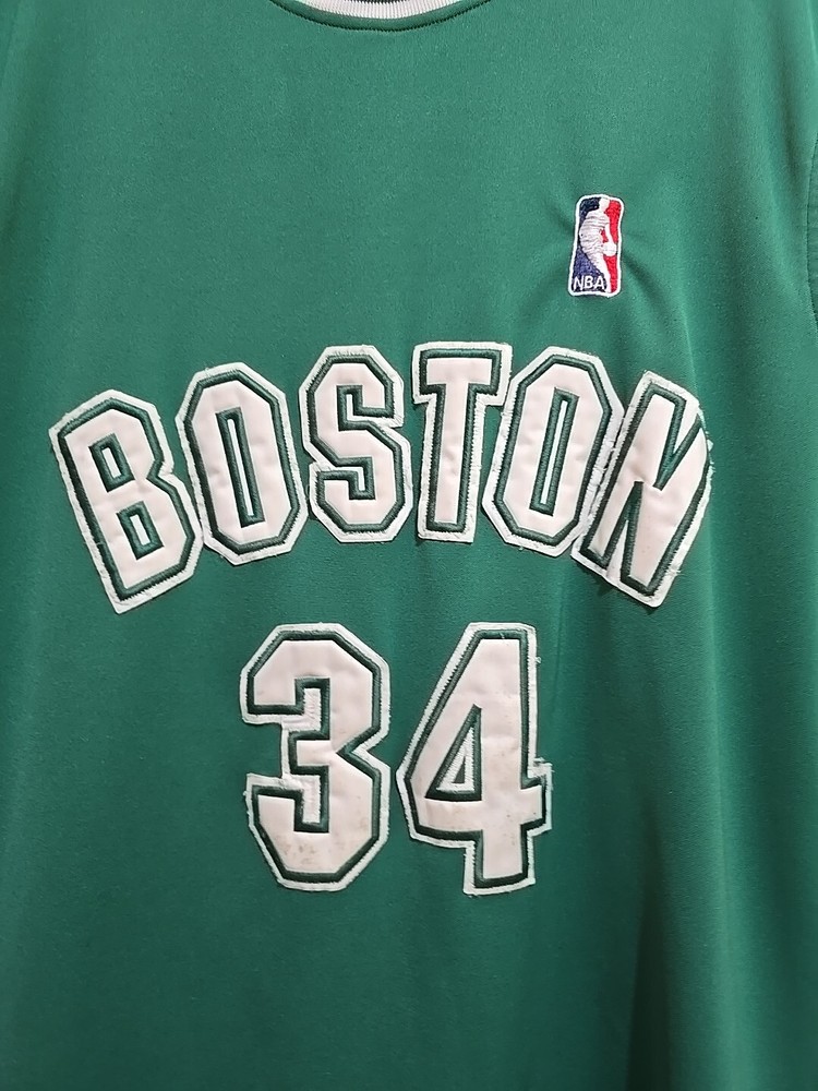 Vintage Boston Celtics #34 NBA Basketball Jersey Embroidered Men's Size XL. LETTERS/NUMBERS HAVE FLAWS/STAINS PICTURED. SEE PICTURES AS PART OF DESCRIPTION. WHAT YOU SEE IS WHAT YOU WILL RECEIVE. MEASUREMENTS ARMPIT TO ARMPIT APPROXIMATELY 26 INCHES. NECK TO HEM APPROXIMATELY 34 INCHES.