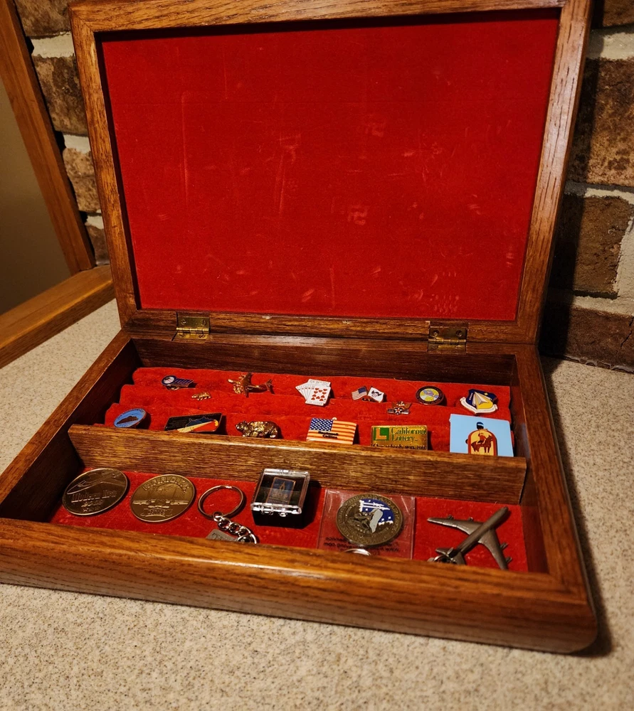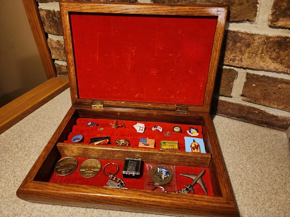 Vintage Box With Air Force Pins: right hinge of box is broken