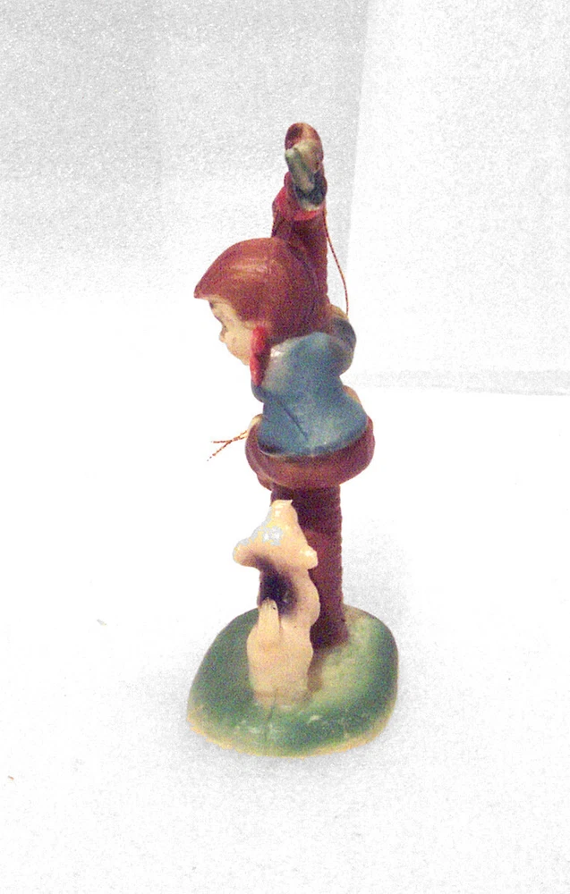 Vintage Boy being chased up a Tree by a Puppy Dog – Christmas Ornament. Hummel Style. Made in Hong Kong. Hard plastic. 4” tall x 2 3/8” wide x 1 ½” deep. Top cord for hanging; figure is free-standing also. Please Note: There is some paint missing the boy’s hair tips in front of face, side of one face and tips of neck bow. Item is being offered, “As Is”. It will be shipped in a small mailing box. PLEASE NOTE: Please forgive the Lighting. I do my best to describe the item as well as possible. In the event item does not arrive to you as described, Please contact me before leaving a Feedback. --------------------------- Buyer pays Actual Shipping plus $0.60 Packaging Fee. No Local Pickups. This item weighs approximately 0 pound 4 ounces US. All communications must be in English. Items are packaged prior to Listing, Therefore No Combined Shipping. --------------------------- If I do not receive a response from the winning bidder after one week, the item will be re-listed. Please contract us if you have any questions. Thank you for your consideration. ZDNZ 241210 4x4x4 C2019