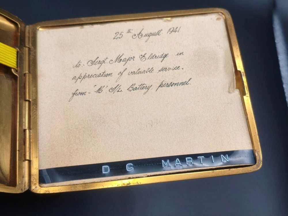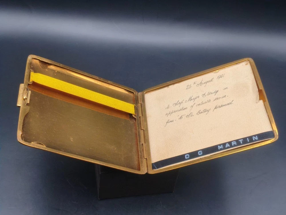 A stunning and historically rich vintage brass cigarette case featuring a detailed engraved world map on both sides. Manufactured by L.S. Mayer & Co. Ltd (Birmingham, England) — a renowned British maker active during the 1930s–1940s, known for high-quality brass and gilt smoking accessories. Inside, the case bears a remarkable wartime dedication dated 25th August 1941, reading: “To Sgt. Major Eldridge in appreciation of valuable service, from 15th A.A. Battery personnel.” A true collector’s piece with authentic provenance and character. ✅ Key Features: ✅ Original L.S.M. (L.S. Mayer & Co. Ltd) hallmark with “FOREIGN” export mark ✅ Engraved world map motif on both sides ✅ Dated 25th August 1941 – authentic wartime presentation ✅ Inner fabric strap (original, yellow) intact and functional ✅ Made in Birmingham, England ✅ Clasp and hinge work perfectly – opens and closes smoothly ✅ Preserved in original, unpolished condition to maintain its patina and historical authenticity ⚙️ Condition: Good vintage condition with visible wear, scratches, and age patina consistent with an 80-year-old piece. The map engraving remains clear and well-defined. 📏 Size: 9.5 × 8.1 × 1.2 cm (3.73″ × 3.18″ × 0.47″) ⚖️ Weight: approx. 130 g (0.29 lb) A unique collector’s item combining wartime history, craftsmanship, and artistry — perfect for collectors of vintage tobacciana, military memorabilia, or early 20th-century design. ✅ Shipping to the USA — all import duties & taxes are fully covered by us. You won’t need to pay anything extra upon delivery.
