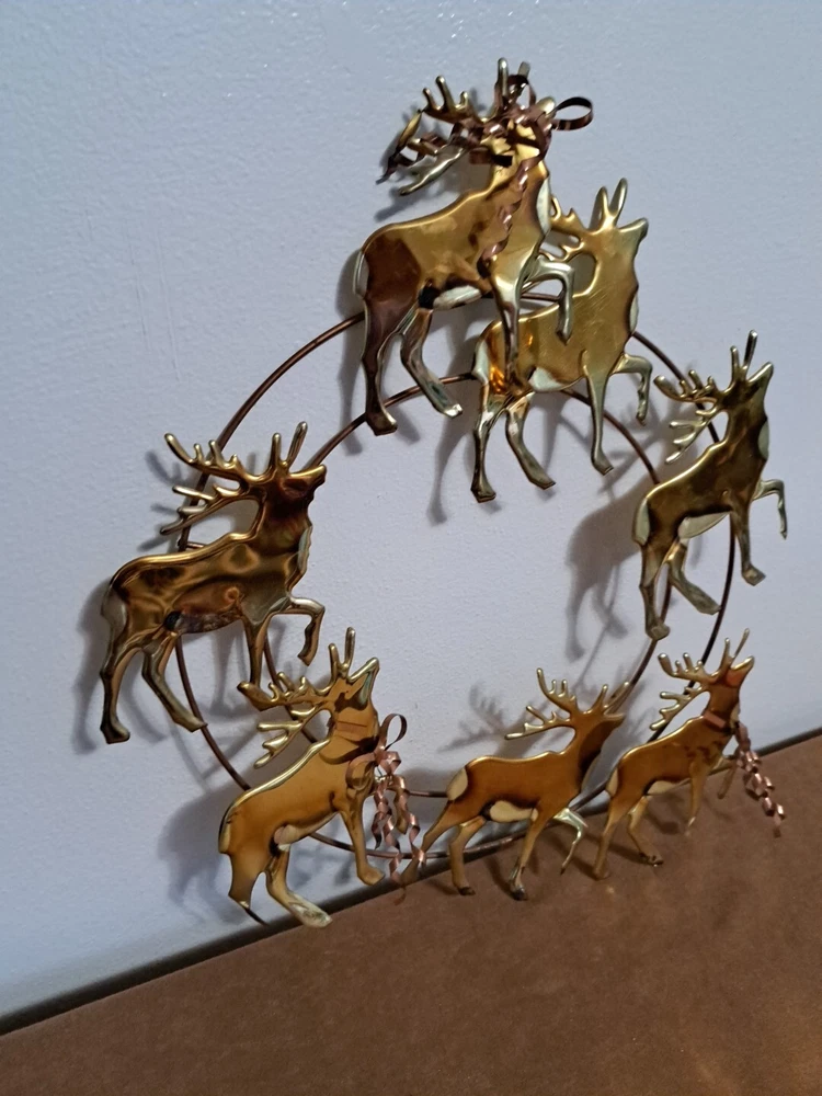 Vintage Brass And Copper Reindeer Wreath. Delicate bows and metal sculpture Reindeer. Some age wear and rust, welds are slightly worn.