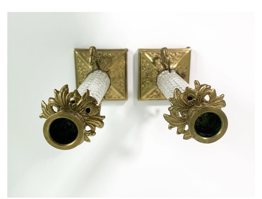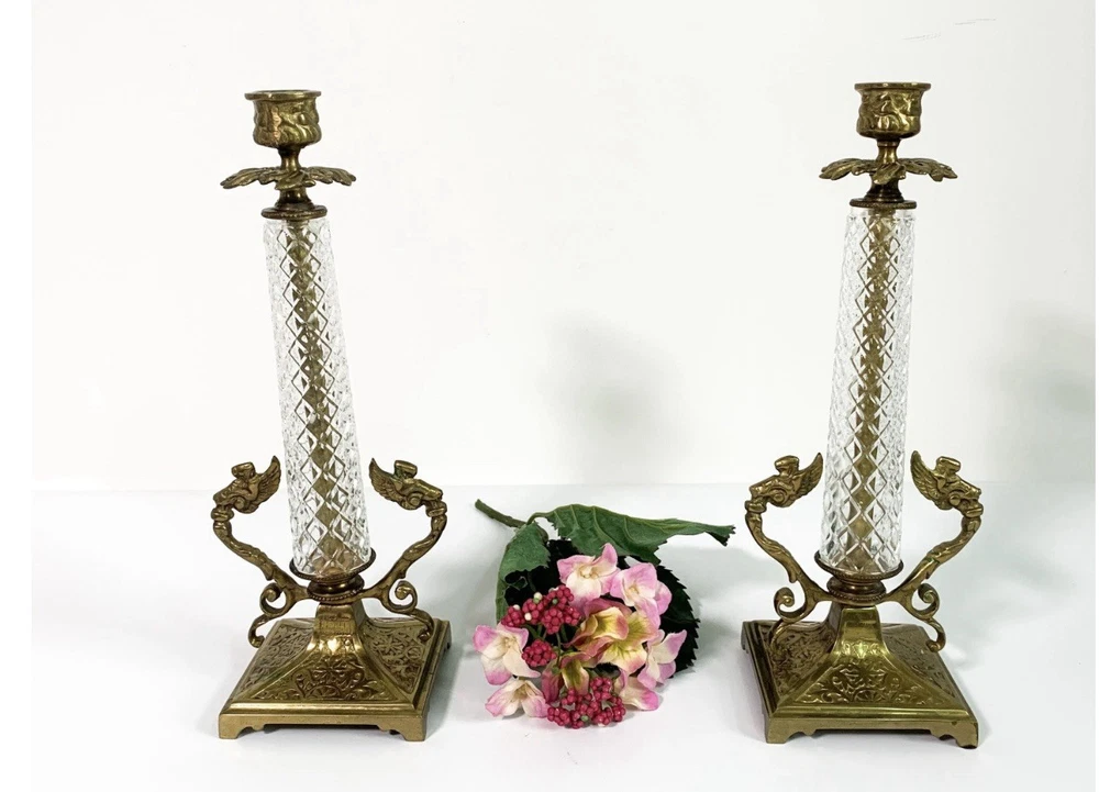 Vintage Brass & Crystal Candleholders MCM Hollywood Regency Ornate W Angels