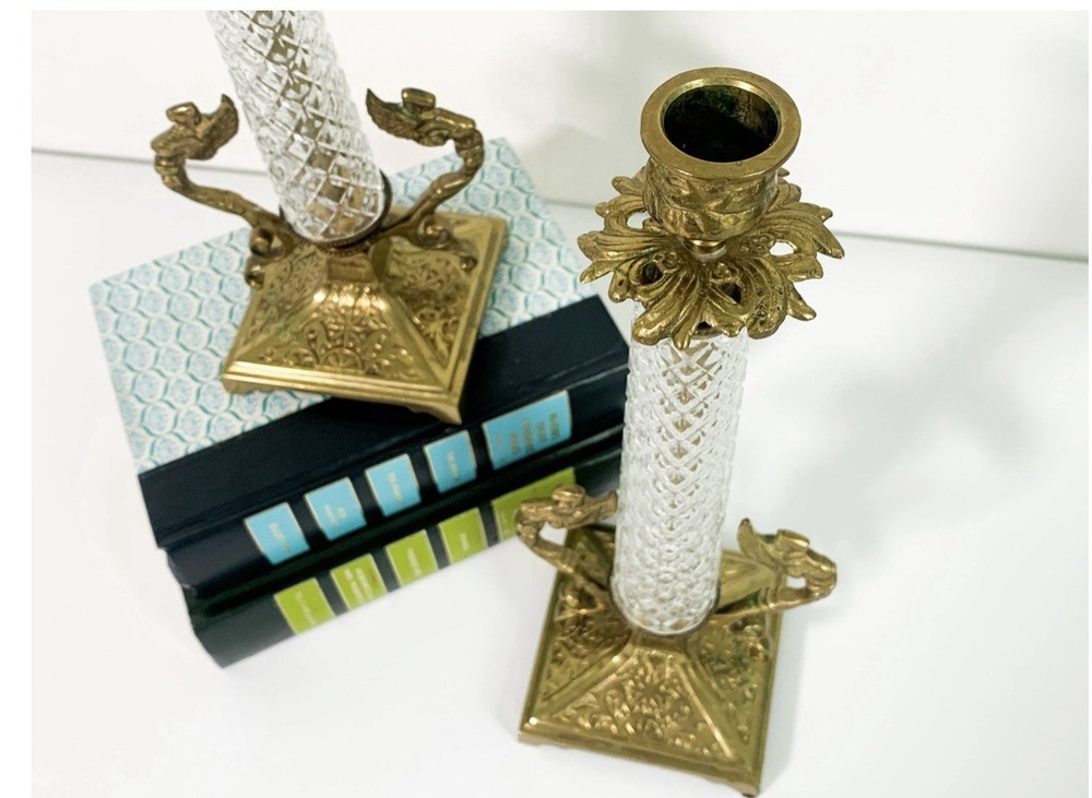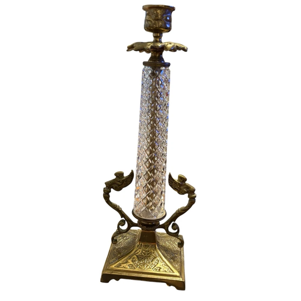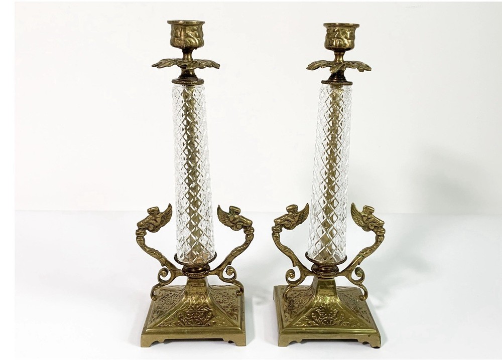 These Vintage Brass & Crystal Candleholders are a stunning addition to any home decor, perfect for all occasions. With a large size, gold color, and exquisite detailing featuring angels and mermaids, they add a touch of glamour and elegance to any room. Made of brass and glass, these candle holders are a unique and decorative piece from the Mid 20th Century that will surely be a conversation starter in any space. Ideal for taper candles, they are a set of 2 and can be cleaned with a damp cloth for easy maintenance.