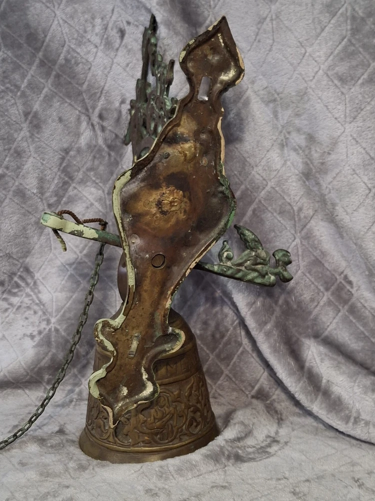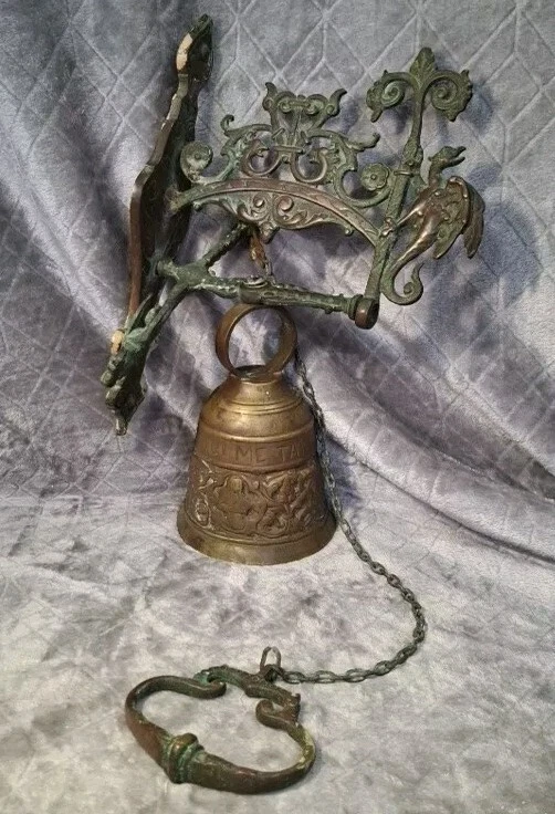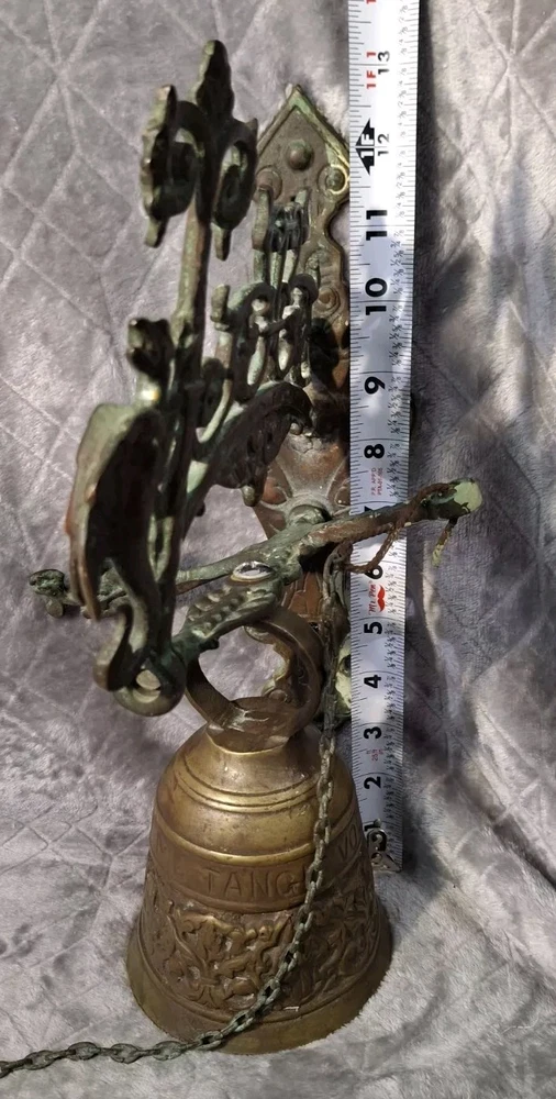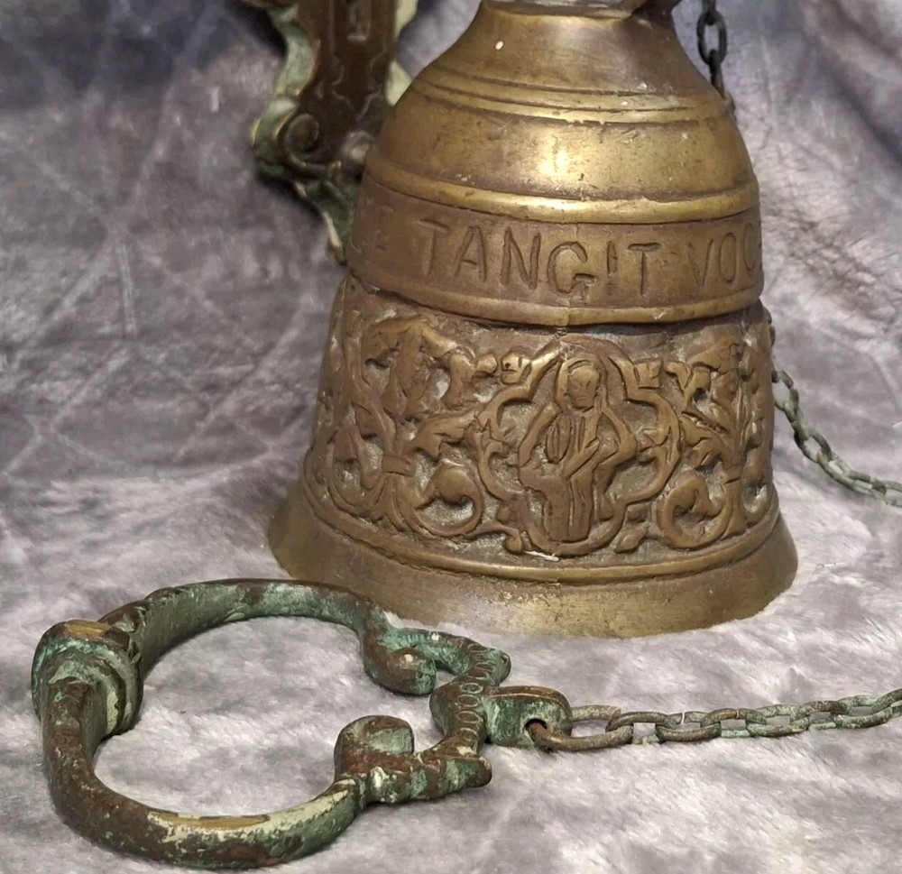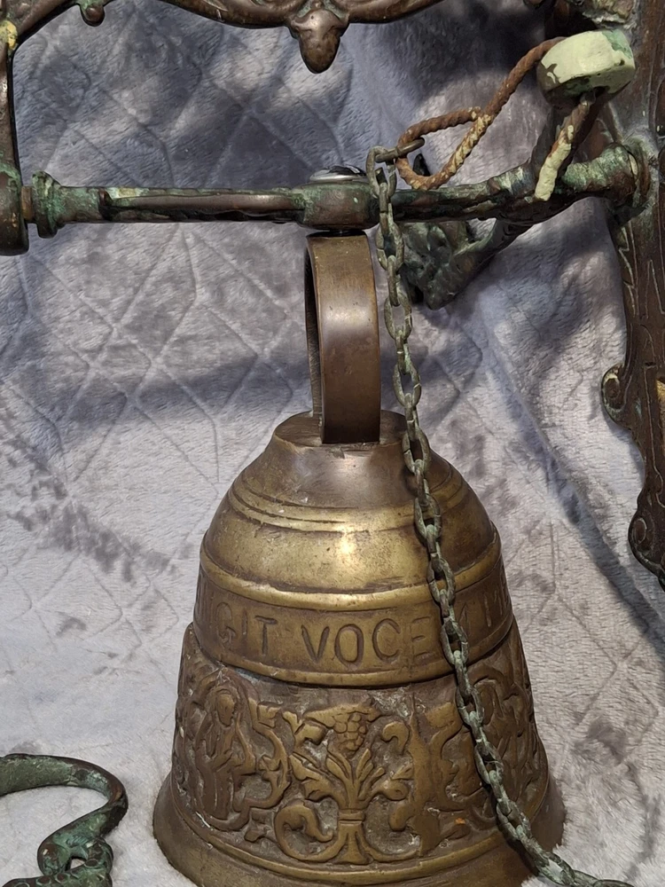 Dragon Wall Mount Audit Qui Me Tangit Vocem Meam Vintage Brass Church Bell Metal Hanger Inscribed with "Audit qui me tangit vocem meam" I looked this phrase up on the internet, and this is what information Ifound - This is often found engraved on church bells and it literally means " Who touches me hears my voice ". Gorgeous vintage bell!! See photos for measurements Has very nice sound It's rather heavy - 5lbs 11.2oz Please view all photos zooming in on them as they are part of the description for you to judge condition. It does have wear, some paint and tarnish/rust/aging. Not sure if the silver screw on top that holds bell on is original see photos. The bar that has the smaller winged creature on one side and the bell ringer hanging from the other side might be a little bent - not sure so wanted to disclose