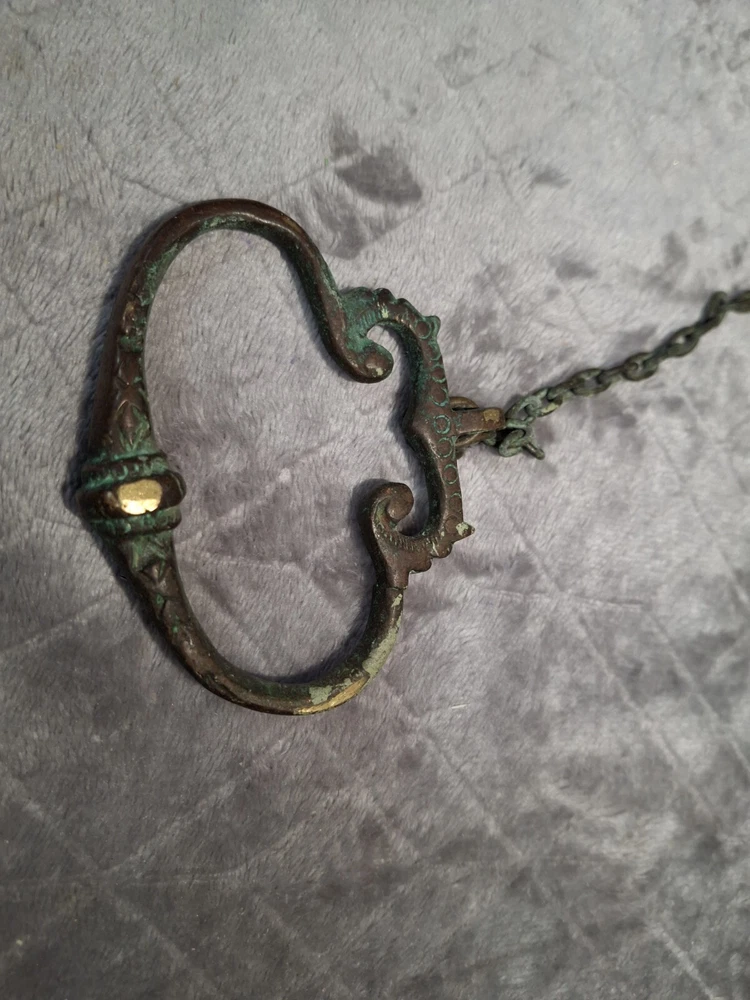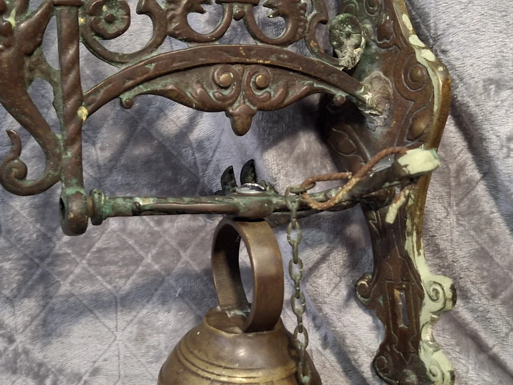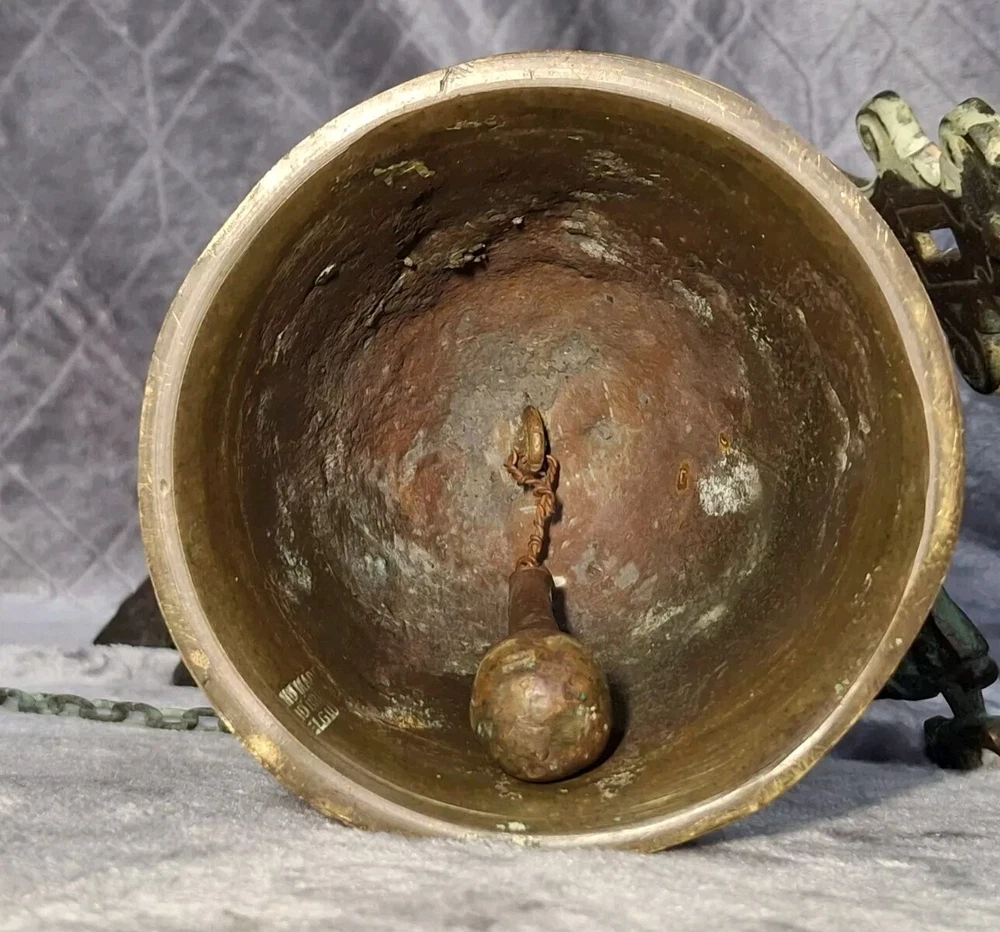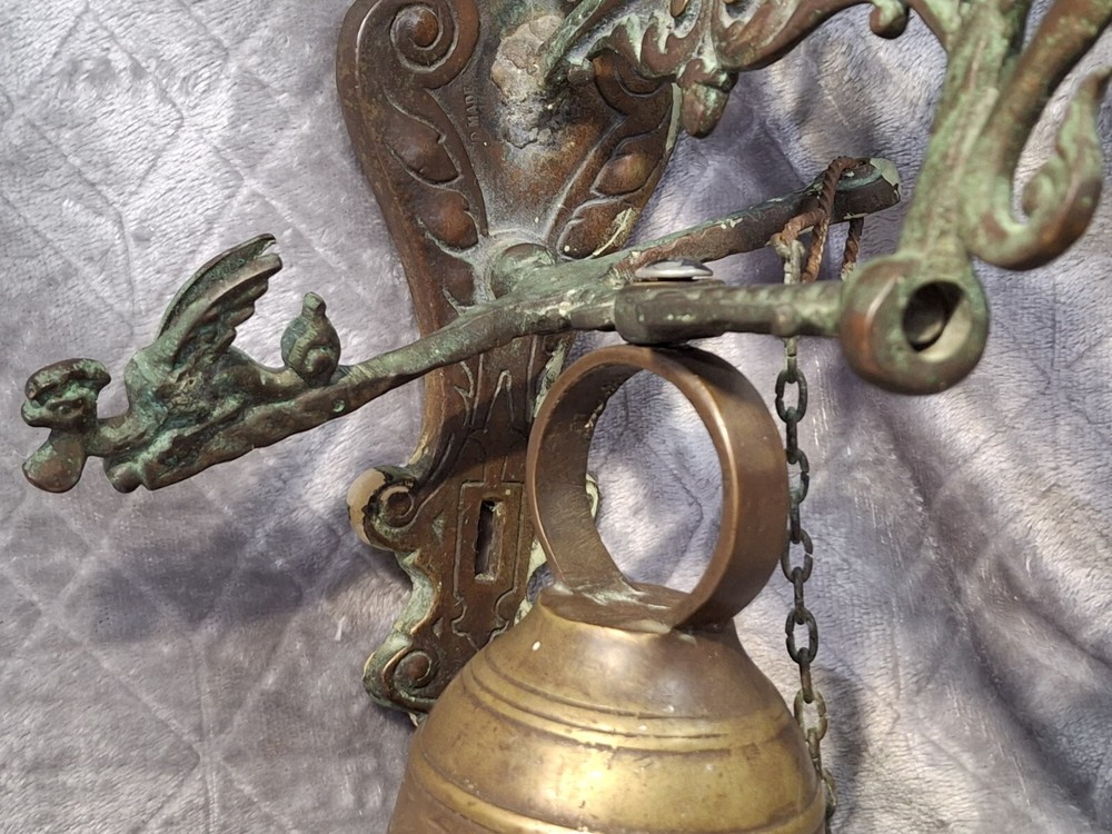 Dragon Wall Mount Audit Qui Me Tangit Vocem Meam Vintage Brass Church Bell Metal Hanger Inscribed with "Audit qui me tangit vocem meam" I looked this phrase up on the internet, and this is what information Ifound - This is often found engraved on church bells and it literally means " Who touches me hears my voice ". Gorgeous vintage bell!! See photos for measurements Has very nice sound It's rather heavy - 5lbs 11.2oz Please view all photos zooming in on them as they are part of the description for you to judge condition. It does have wear, some paint and tarnish/rust/aging. Not sure if the silver screw on top that holds bell on is original see photos. The bar that has the smaller winged creature on one side and the bell ringer hanging from the other side might be a little bent - not sure so wanted to disclose