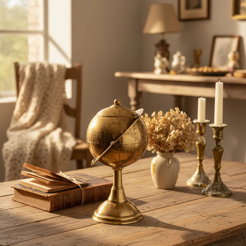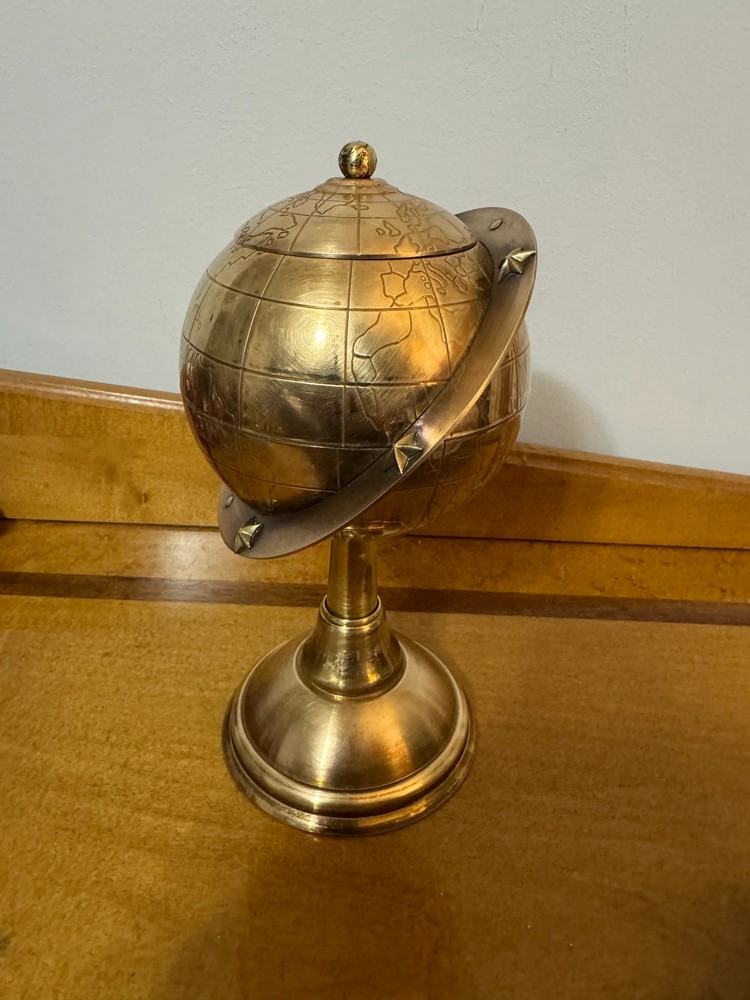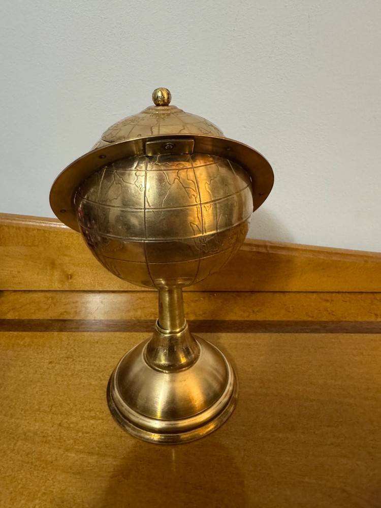 Uncover the unique appeal of this exceptional vintage brass globe cigarette dispenser holder. This stunning piece is a perfect addition to elevate any collection, showcasing a distinctive MCM style! CONDITION: It is pre-owned but in good condition. It has some scratches and a bit of age patina, but it is still beautiful and functional. See the attached photos. Color: Brass Materials: Brass, aluminium Measurements: 8.25 in. H x 5 in. W x 4.25 in D, approximately "All our items are sold as is." We are committed to providing you with the best customer experience and affordable prices. Thank you for supporting our small business and for contributing to a better, cleaner world.