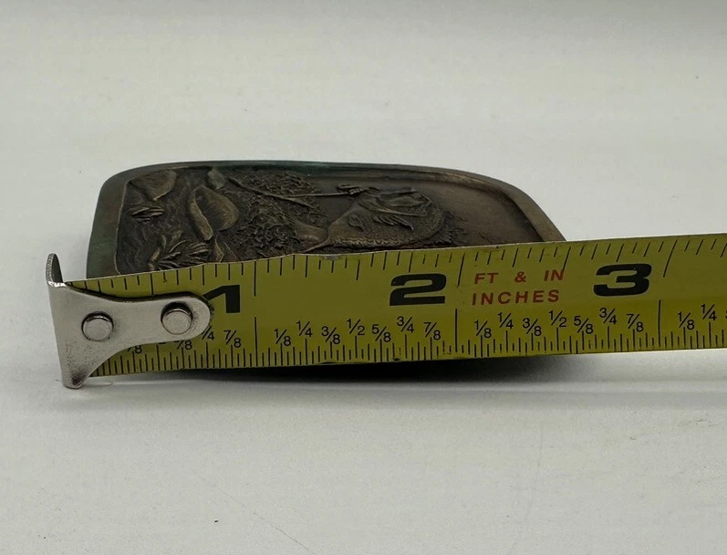 This vintage brass belt buckle from Indiana Metal Craft features a bass fish pattern with accents of bronze color. The buckle is 2 1/4" wide and fits a 1.75" belt. It was produced in 1976 and is a great addition to any collection. The buckle is perfect for men who love fishing and want to add a unique touch to their accessory collection. The hardware material is brass and the style is a single tongue buckle. This item is perfect for those who appreciate vintage accessories and want to make a statement.