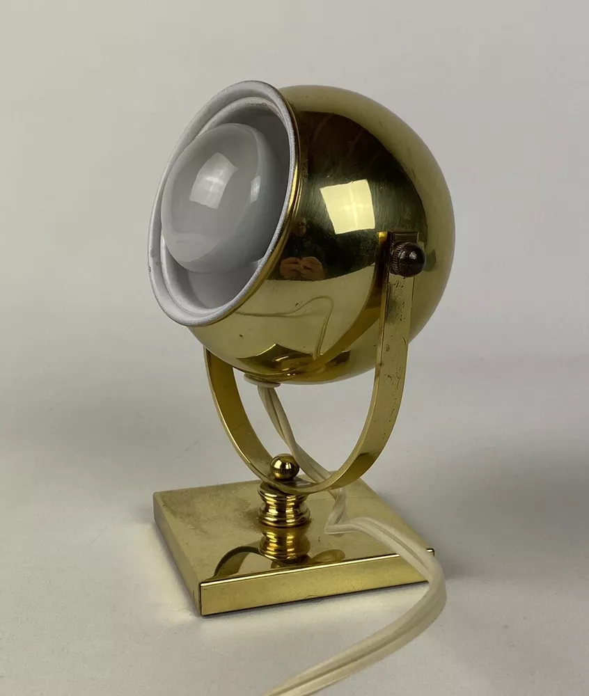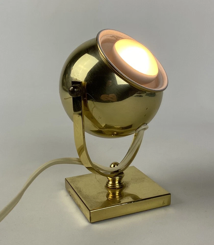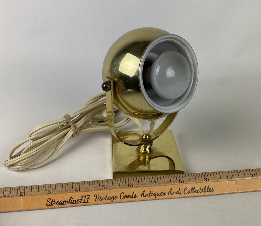 Add a touch of vintage charm to your space with this unique brass lamp. With a diameter of 6 inches, this small desk lamp features a rotating globe sconce with an atomic eyeball design, perfect for any mid-century modern enthusiast. The lamp is made of brass and metal, with a gold color that gives it a luxurious appeal. This original Reed & Barton lamp has a cord switch for easy control and comes with a bulb/tube included. It has an adjustable feature that allows you to direct the light exactly where you need it. This lamp is perfect for adding a cozy and retro vibe to any room, and it was manufactured in the 1970s, making it a true vintage piece. Most of our items are second hand and have some shelf wear on them. We do not guarantee mint condition unless otherwise noted. All items in the photos are of the actual product being shipped directly to you (minus display props and measuring devices) If an item is not in the photos, please do not expect it. If you have any questions or concerns, please reach out to us. Our feedback speaks for itself. We do all we can to keep you satisfied with your buying experience from Streamline717