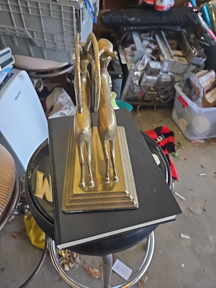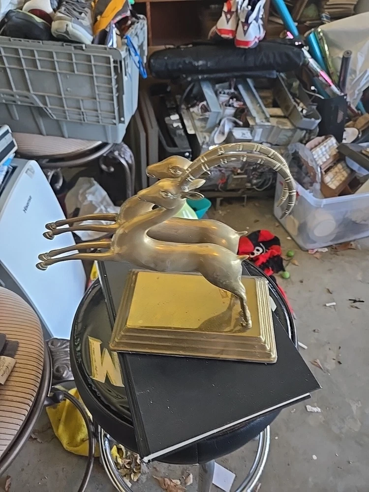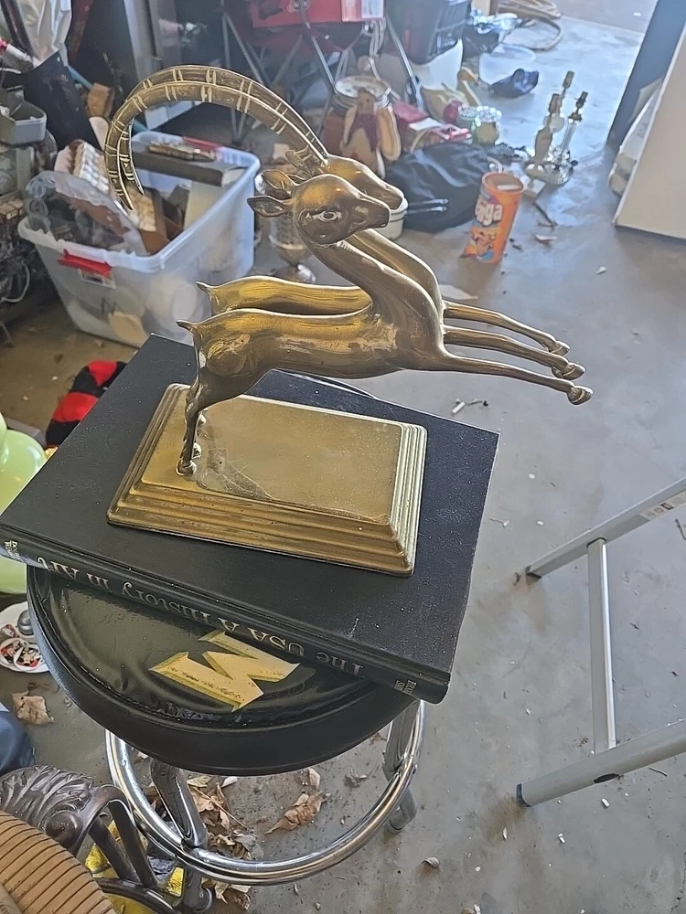 This vintage brass sculpture features leaping gazelles, or impalas, and is a stunning addition to any collection. The piece measures 10 inches in height and 10 inches in width, and has a modern style with a polished brass finish. The sculpture is an original piece from Korea, and would make a great gift for any animal lover or collector. The sculpture is made of brass and has a felt bottom for added detail. It is perfect for display on any occasion and would look great in any home decor. The sculpture is part of the wildlife collection and the theme is animals and dinosaurs.