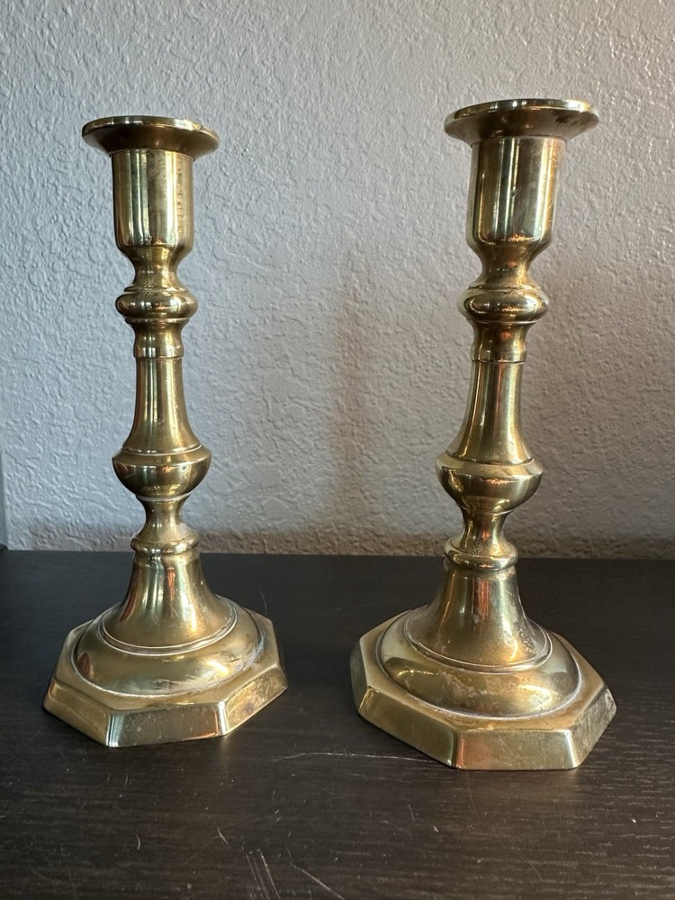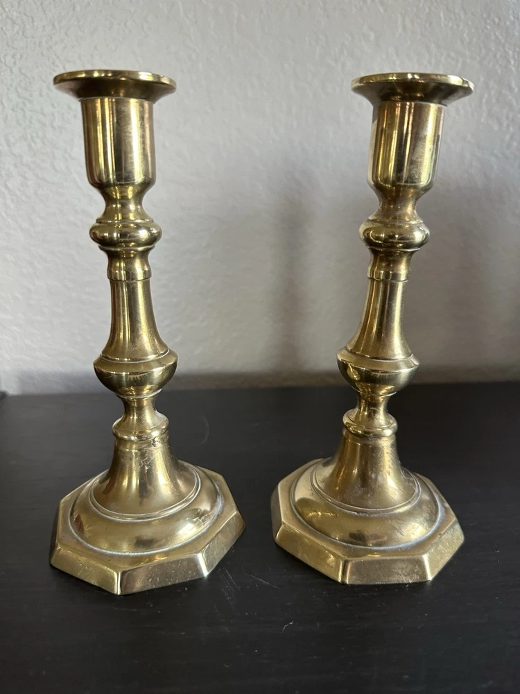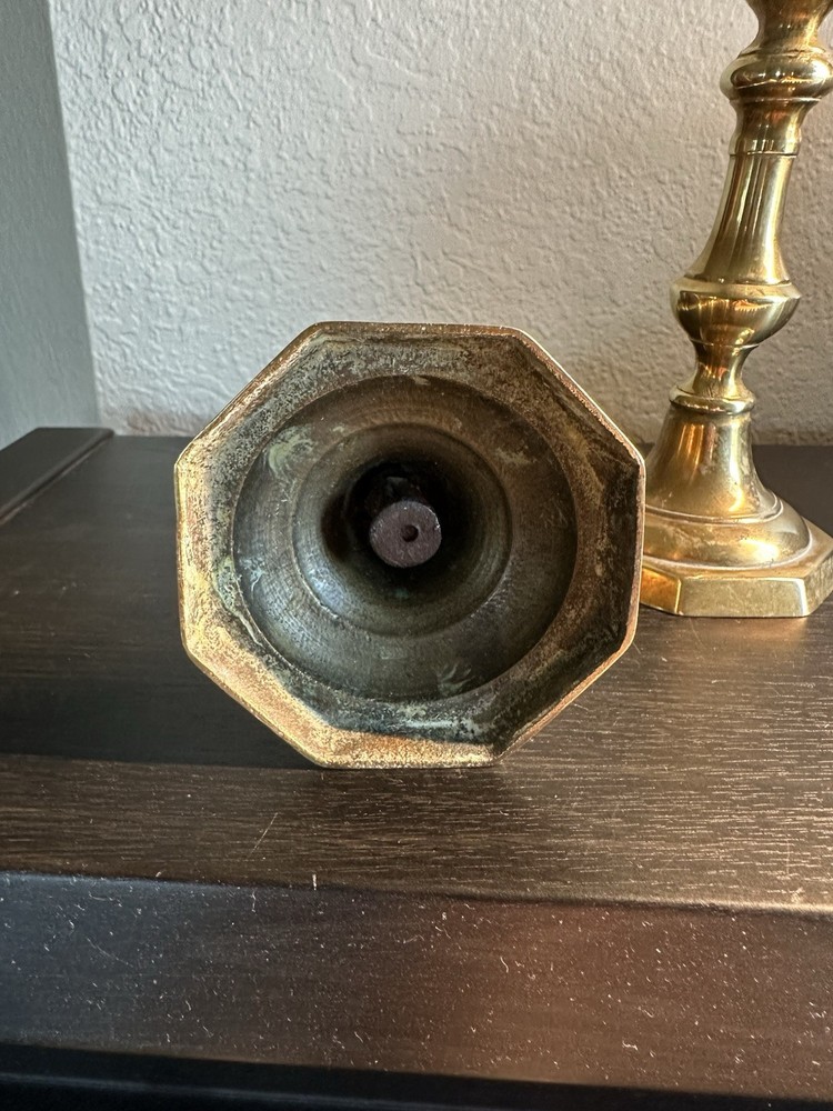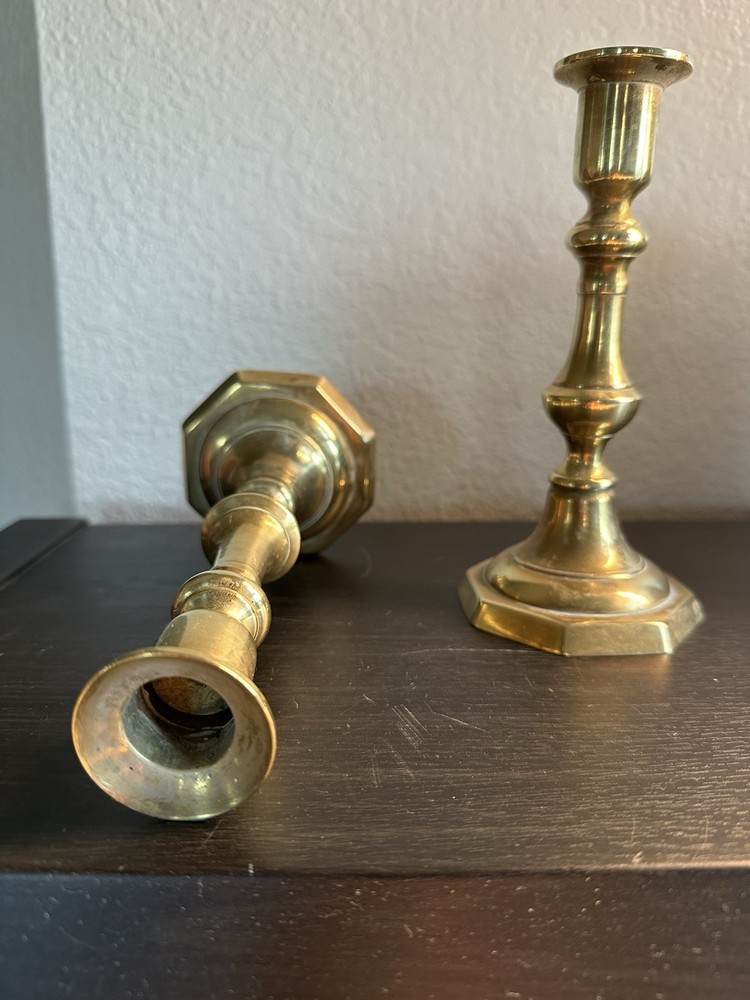🕯️ Timeless pair of solid brass candlestick holders 📏 7.25” tall × 3” octagonal base × 1” candle cup 🏡 Perfect for colonial, farmhouse, traditional, or vintage-style decor 🌟 Beautiful aged brass with light patina – full of character! 💪 Heavy and sturdy — true vintage quality 🎁 Makes a lovely gift or elegant accent for mantel, dining table, or shelf 🔎 Unsigned, mid-century or earlier reproduction of Georgian style Blessings! ⸻ 💡 Keywords vintage brass candlesticks colonial candle holders solid brass decor antique-style candlesticks farmhouse brass taper holders 7 inch brass pair octagon base candle holders mid century traditional decor classic brass home accents collectible brass pair