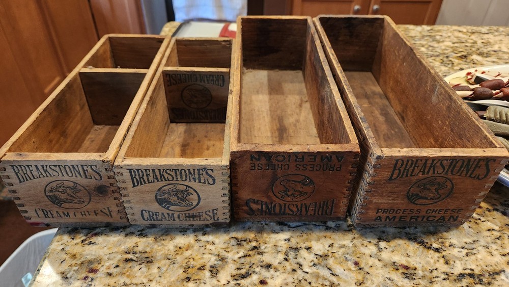 Vintage wooden Breakstone Cheese boxes These collectible-style crates (like 2 lb, 3 lb, or 5 lb original cream cheese boxes) Authentic branded boxes, dovetail joints, rustic patina for optimal display, décor or storage