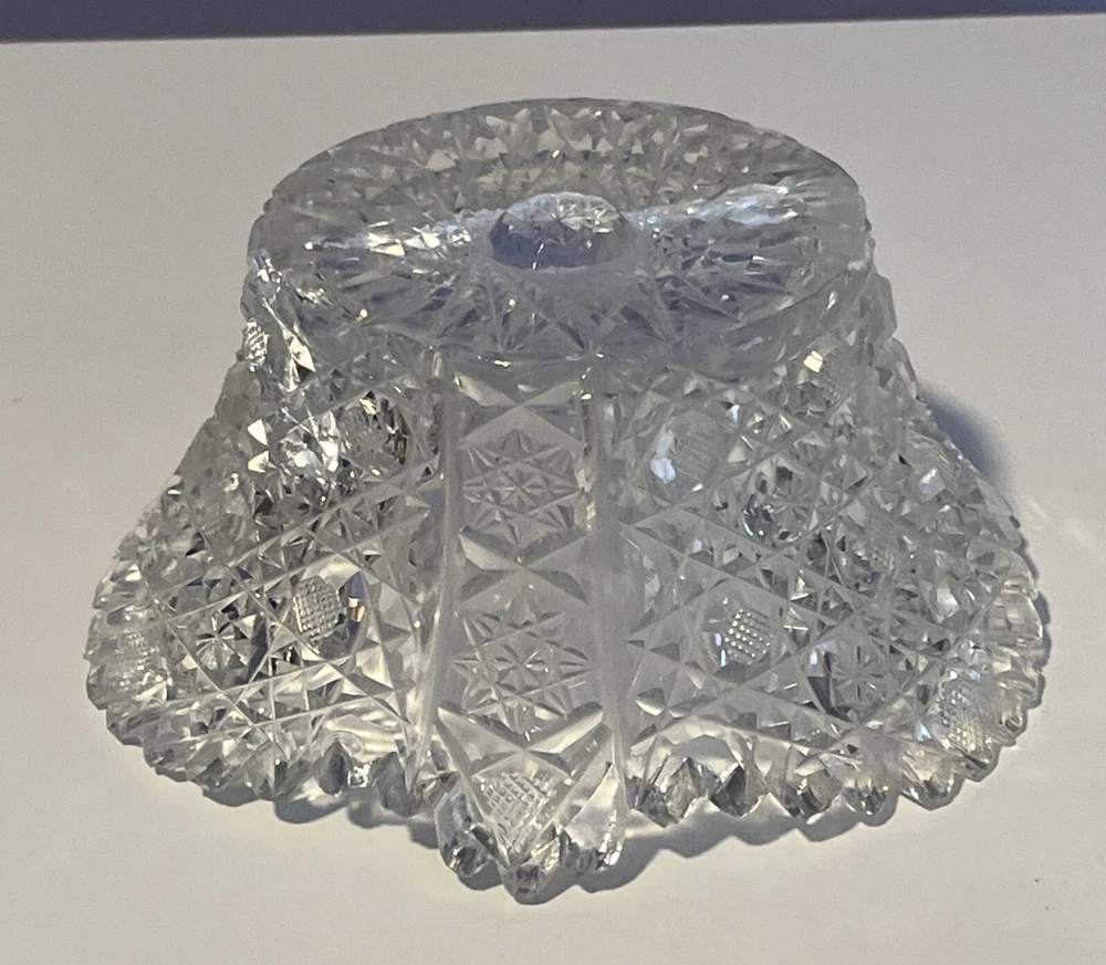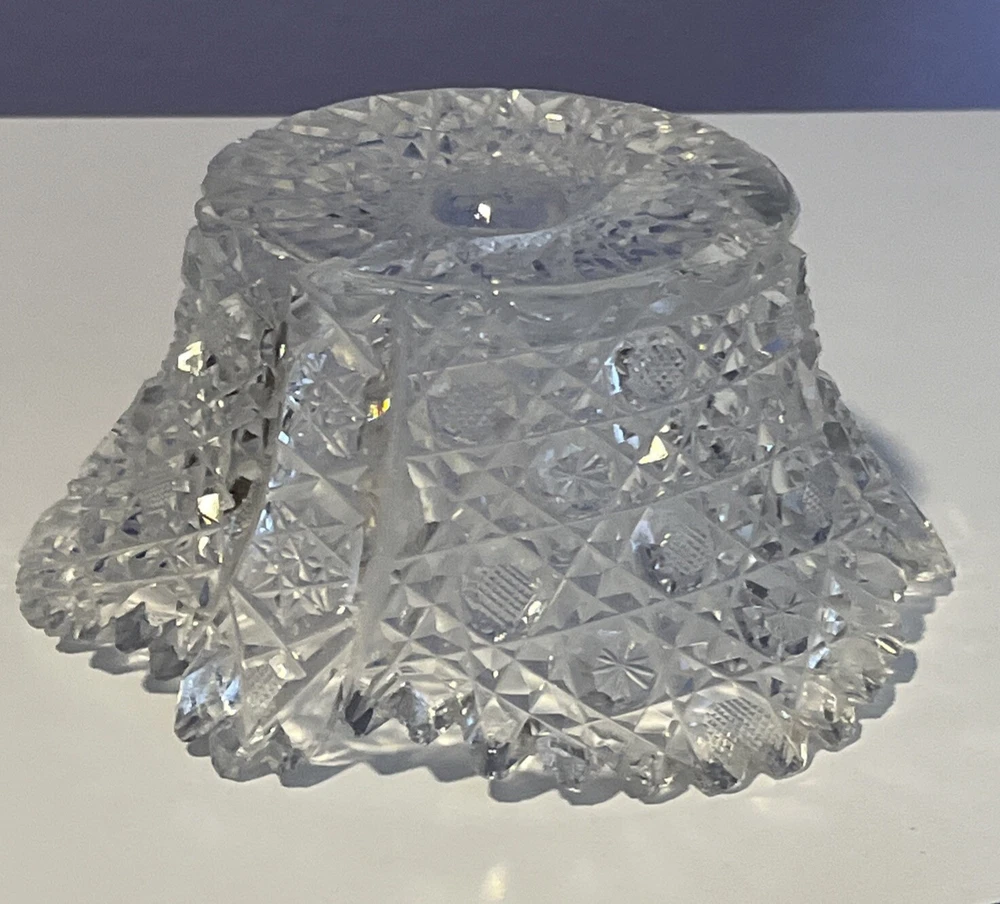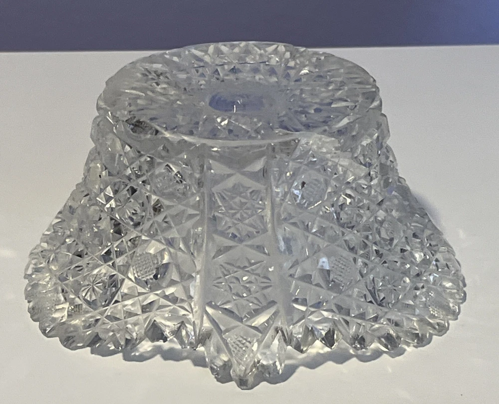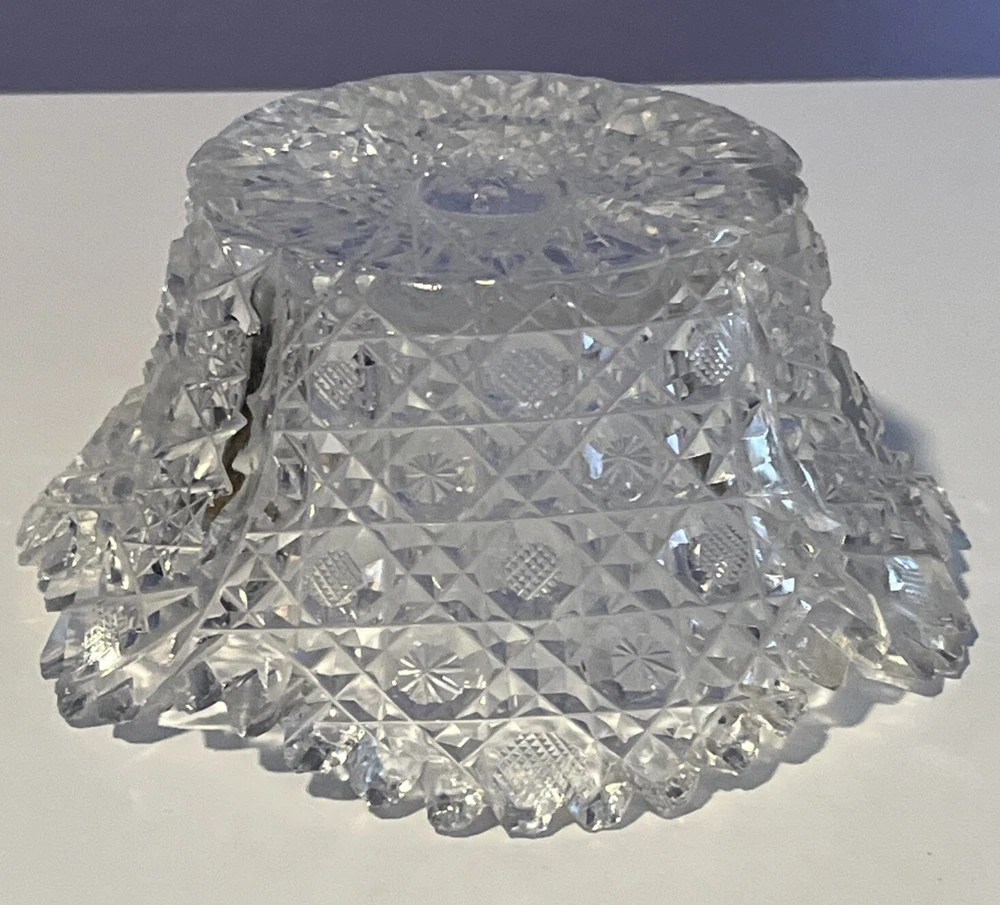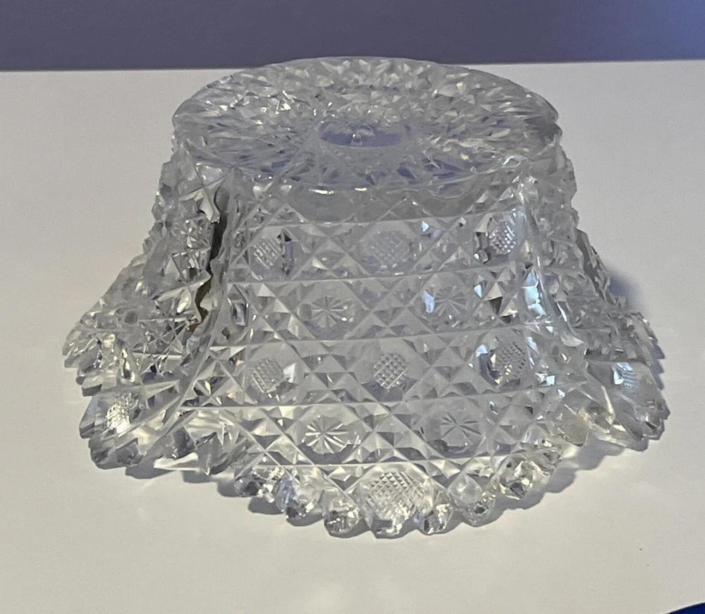 Vintage Brilliant Cut Daisy Buttons Bowl or Punch Bowl Stand - 6" diameter on open "top" portion of bow, 2.5" tall, 3.5" diameter on bottom or flat portion. This once glorious piece still have much life for display and use. It is cracked as seen in pictures so priced accordingly. The pattern picks up the light and you can feel the hand cut crystal when you pick up the piece. It's a unique pattern combo with what appears to be Daisy and Buttons interchanged with Hobstar as you go around the bowl, and it has a unique scallop at the top where it differs for these various sections. Please review all pictures carefully as they are part of the description. Questions are welcome.