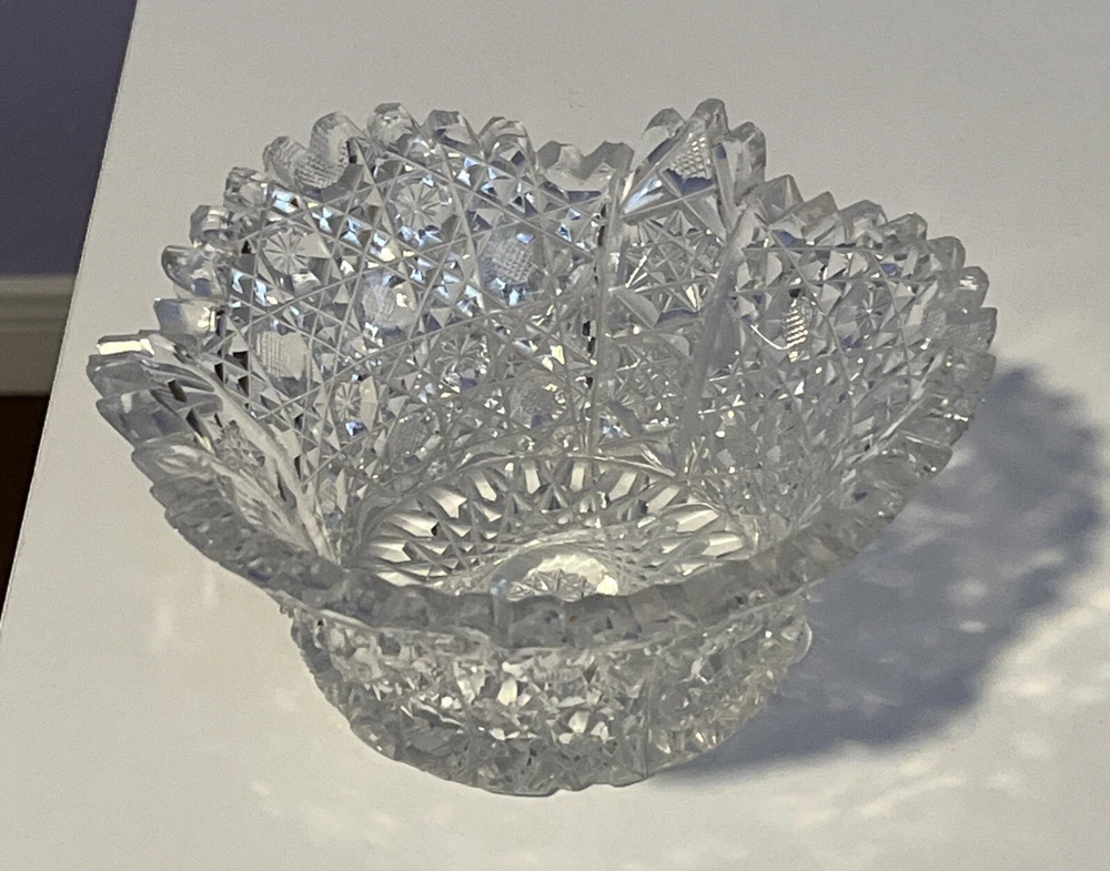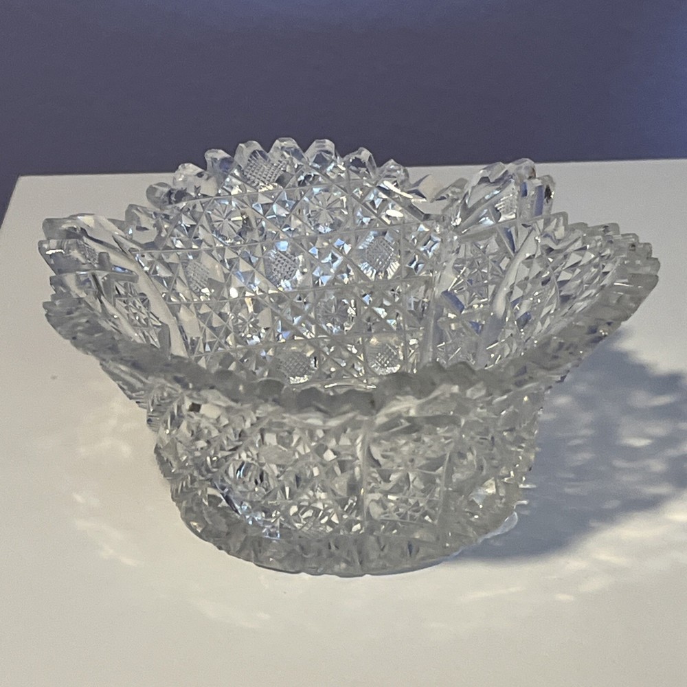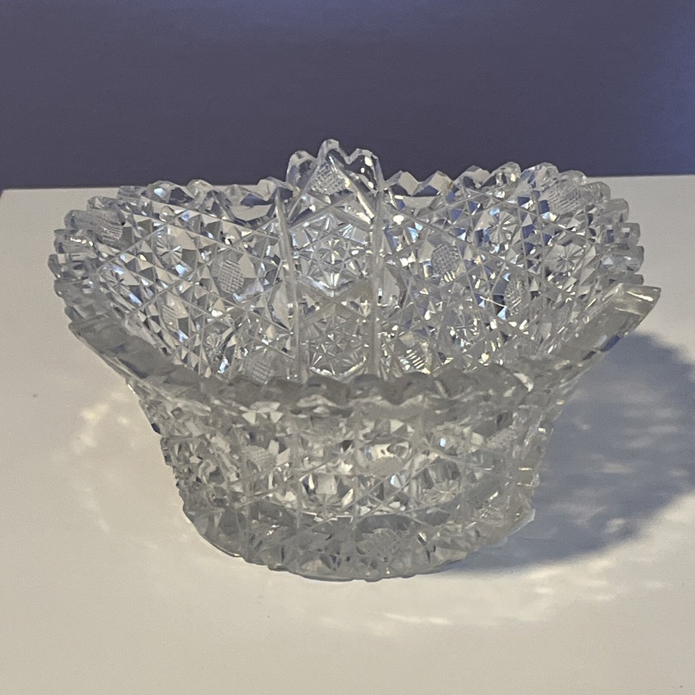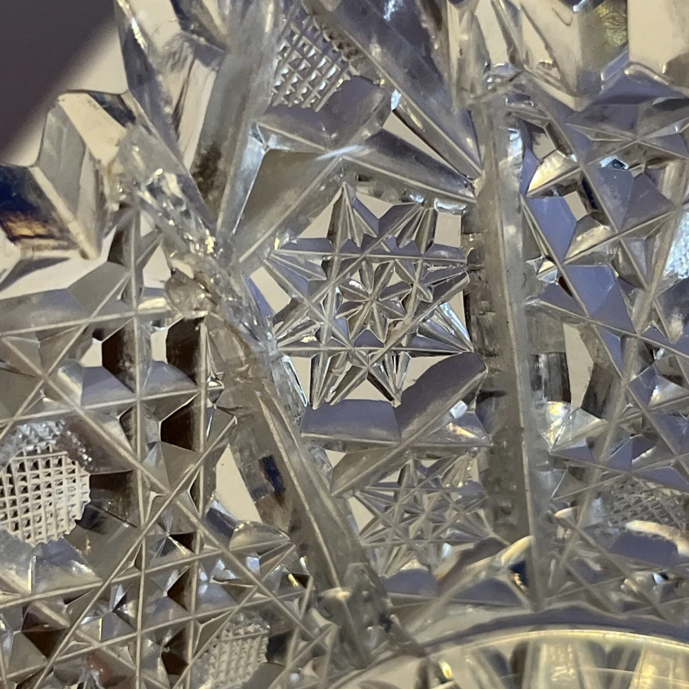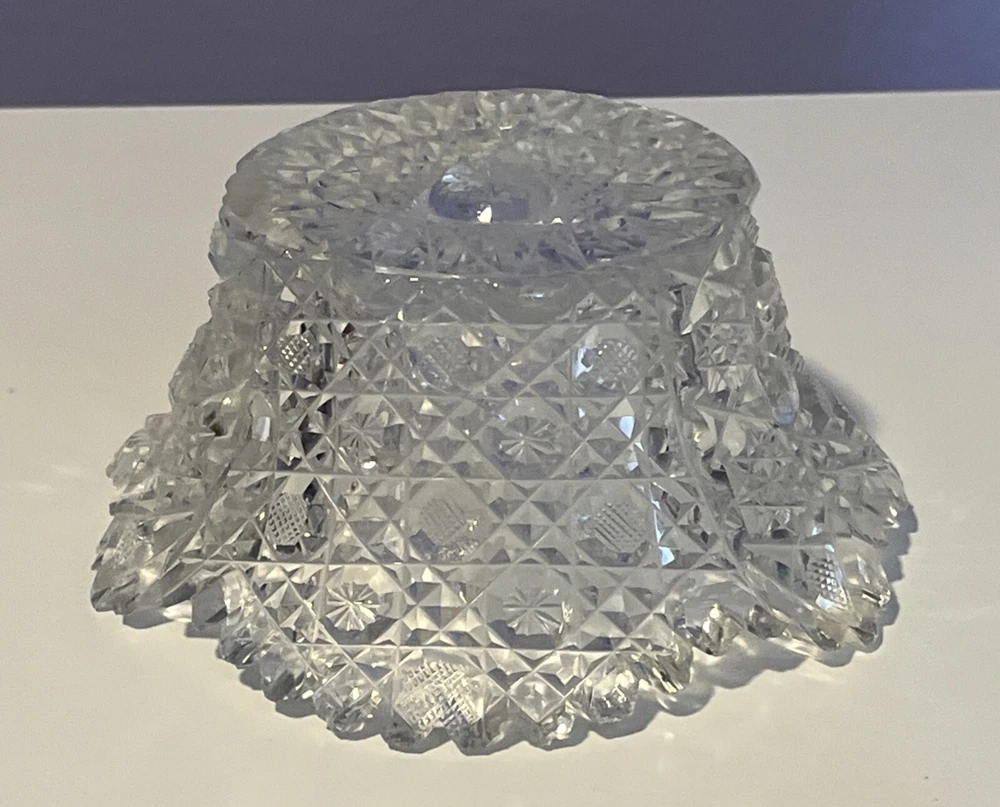 Vintage Brilliant Cut Daisy Buttons Bowl or Punch Bowl Stand - 6" diameter on open "top" portion of bow, 2.5" tall, 3.5" diameter on bottom or flat portion. This once glorious piece still have much life for display and use. It is cracked as seen in pictures so priced accordingly. The pattern picks up the light and you can feel the hand cut crystal when you pick up the piece. It's a unique pattern combo with what appears to be Daisy and Buttons interchanged with Hobstar as you go around the bowl, and it has a unique scallop at the top where it differs for these various sections. Please review all pictures carefully as they are part of the description. Questions are welcome.