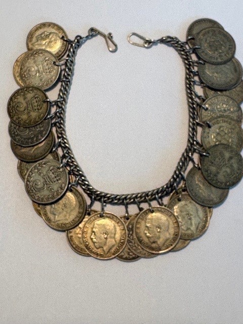 1.71 ounces of Sterling Silver Offered for sale is a vintage British silver coin bracelet crafted from thirty (30) authentic British Threepence coins , each featuring the portrait of George V or George VI . These historic coins were minted in sterling silver and date from the early 20th century. The bracelet forms a beautiful piece of vintage coin jewelry , combining historical British currency with classic handcrafted design. Each coin is securely linked to create a substantial bracelet finished with a hook clasp , giving the piece both durability and authentic vintage character. This is a unique collector’s item for those who appreciate numismatic jewelry, British history, or vintage silver accessories . Item Details • Authentic British Threepence (3d) silver coins • Thirty (30) coins total • Portraits of King George era British monarchs • Vintage handcrafted coin bracelet • Secure hook clasp closure • Attractive vintage patina • Excellent collector or gift piece Condition Very nice vintage condition with normal wear consistent with age. Coins display attractive detail and natural patina. The bracelet links and clasp function properly. Please review all photos carefully as they form part of the description. Shipping Item will be carefully packaged and shipped with tracking to ensure safe delivery.