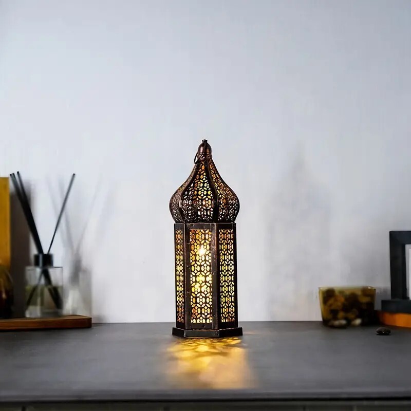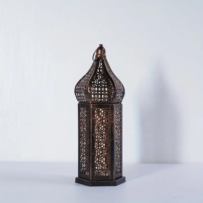 Vintage Moroccan LED Lantern is a beautifully crafted decorative lamp designed to add a touch of rustic charm to any space. This lantern is made from high-quality metal and features an intricate filigree design that casts a warm, inviting glow when lit. The detailed craftsmanship creates a stunning pattern of light and shadows on the surrounding surfaces, enhancing the ambiance of your home, office, or tabletop. The lantern has a hexagonal base and a domed top with a loop for hanging. The dimensions of the large lantern are approximately 13.91 inches (33.5cm) in height, 4.764 inches (12.1 cm) in width, and 4.764 inches (12.1 cm) in depth (Batteries Not Included).