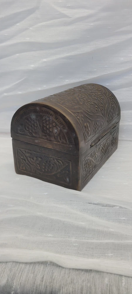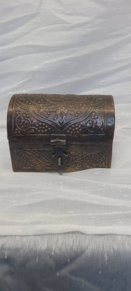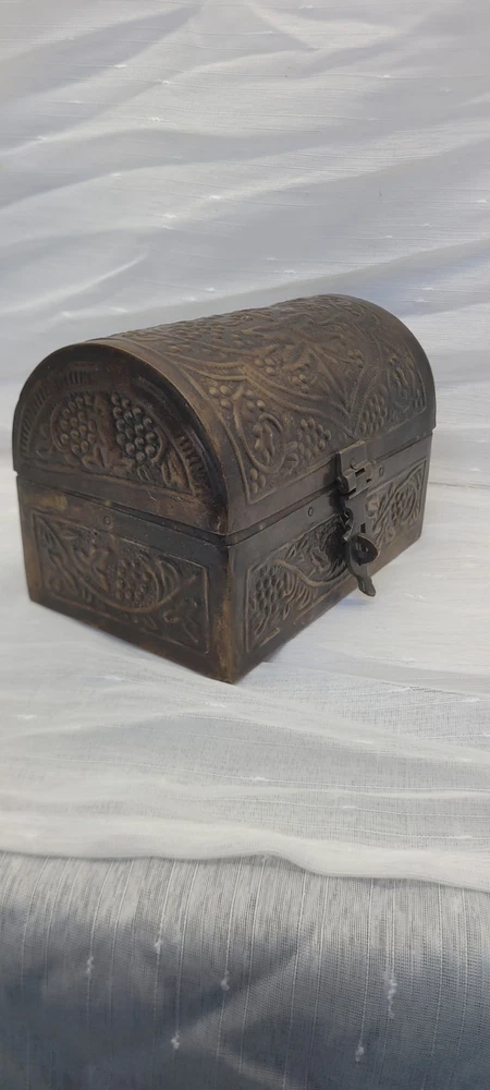 Vintage Bronze Treasure Chest Jewelry Box with Embossed Metal Dome