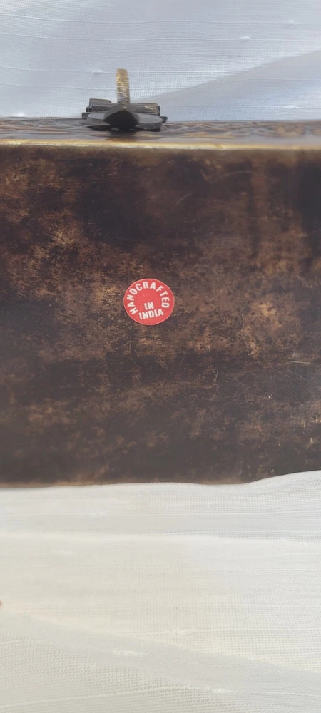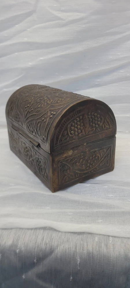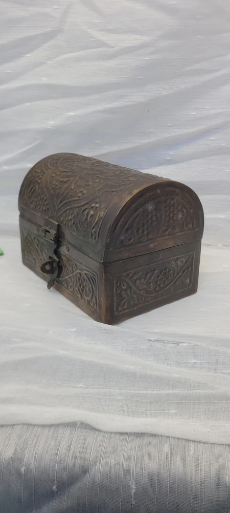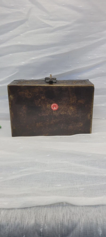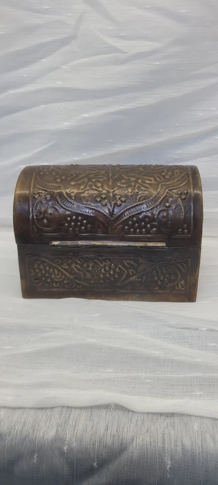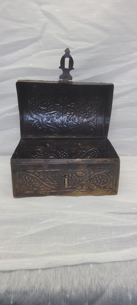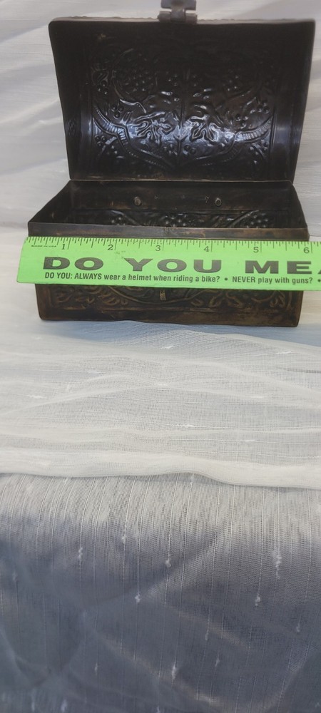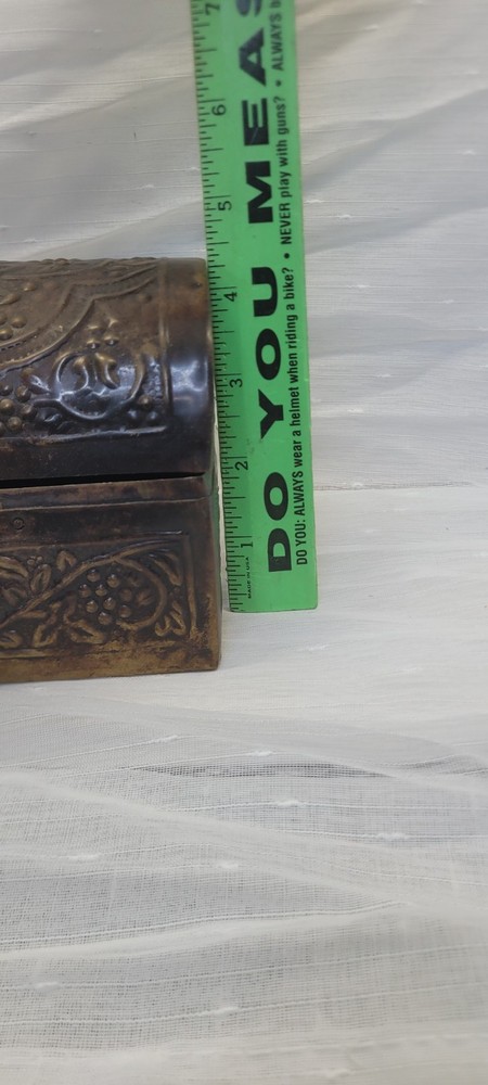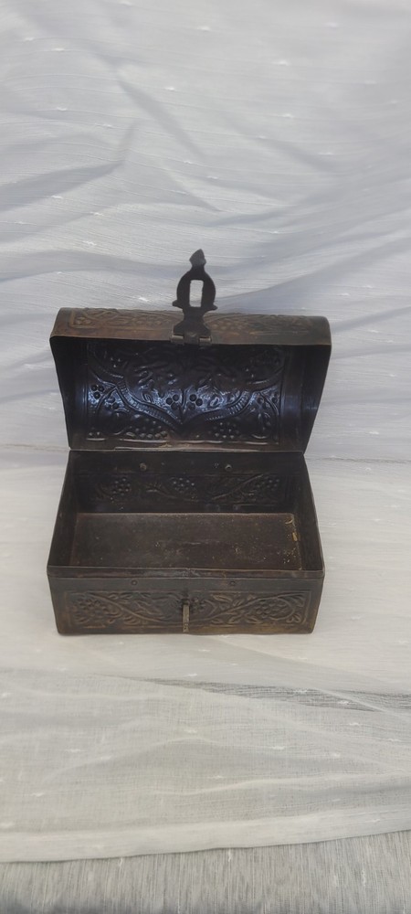 Pattern: Floral, Embossed, Hinged, Latch Collection: Keepsake Boxes Type: Treasure Chest Size: Medium Country/Region of Manufacture: India Closure Type: Hinge Material: Metal Features: Boxed Subject: Boxing Era: Late 20th Century (1970-1999) Style: midevil Original/Reproduction: Original Color: Brushed Bronze Shape: Rectangle Item Height: 4.5 in Brand: Handicraft Finish: Embossed Item Length: 6 in Handmade: Yes Packaging: Box Occasion: All Occasions