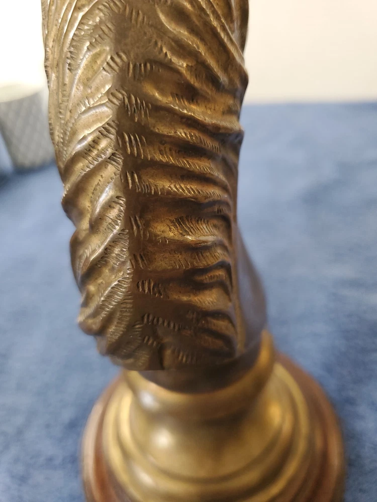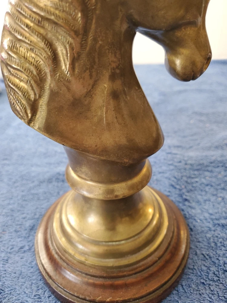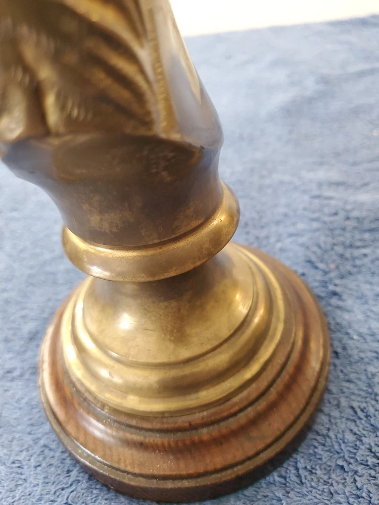 Vintage Bronze look Finish Horse Head Sculpture Bookend on Wooden base. 9 in tall with a 5" round wooden base. Very heavy and very old.