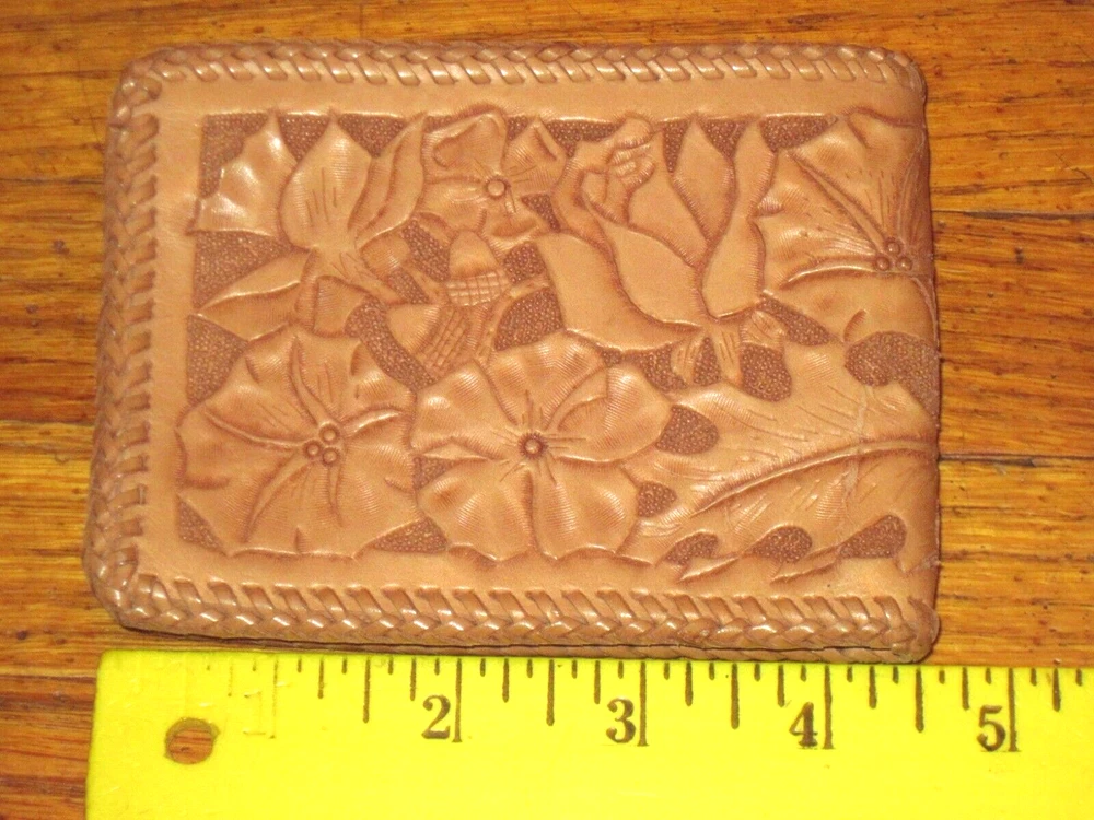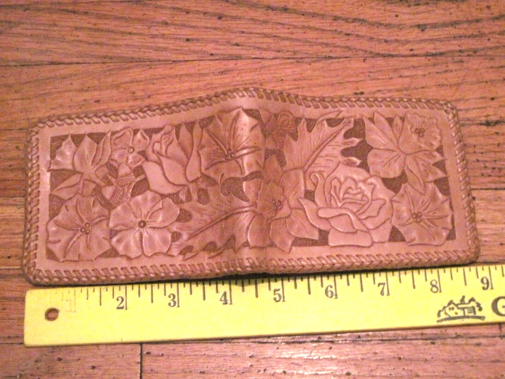 Vintage Brown Floral Pattern Embossed Tooled Men's Leather Bifold Wallet New. Bifold wallet is 4 5/8" long X 3 1/2" wide. Bill Slot, ID card window , coin pocket. Comes from a pet free smoke free shop.