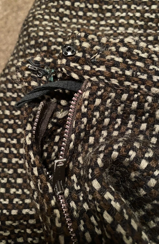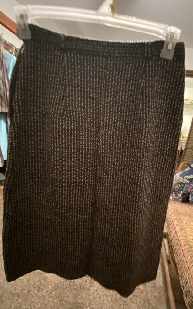 Embrace vintage fashion with this beautiful brown skirt from Oakmont Sportswear, Inc. The skirt is made of 100% wool, ensuring warmth and comfort during colder months. The size 14 skirt fits regular size types and is perfect for those who love 1960s fashion. The skirt features a classic brown color that complements any outfit and is perfect for any occasion. The unique design and quality material make it a must-have for any vintage clothing collection. Don't miss out on the opportunity to own this timeless piece. Skirt has belt loops for skinny belt, side zipper w/snap&hook and loops inside for hanging. Features an vogue 60’s weave.