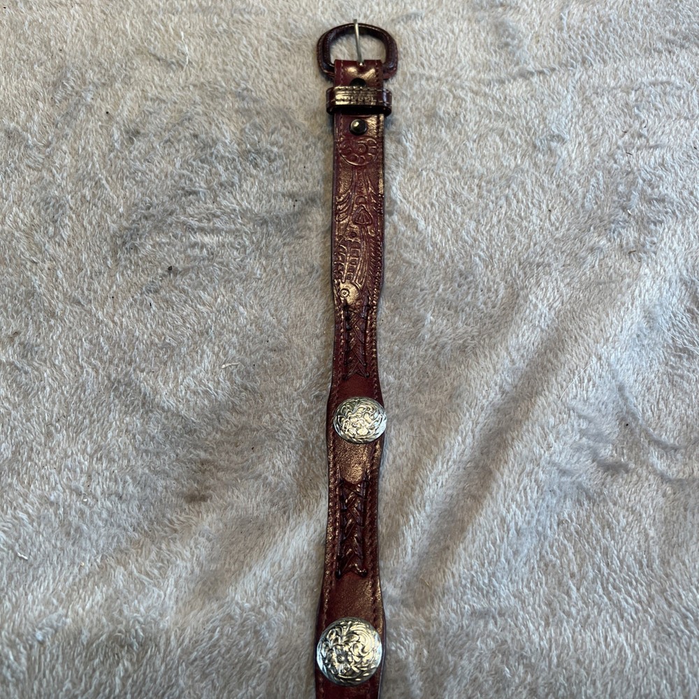This vintage brown western style belt with conchos in size 30 is made of leather with studded accents, giving it a unique and stylish look. The 1-inch belt width and western-themed hardware make it a classic piece for both men and women. Perfect for adding a touch of cowboy flair to any outfit, this belt is a timeless accessory for those who appreciate vintage American style.