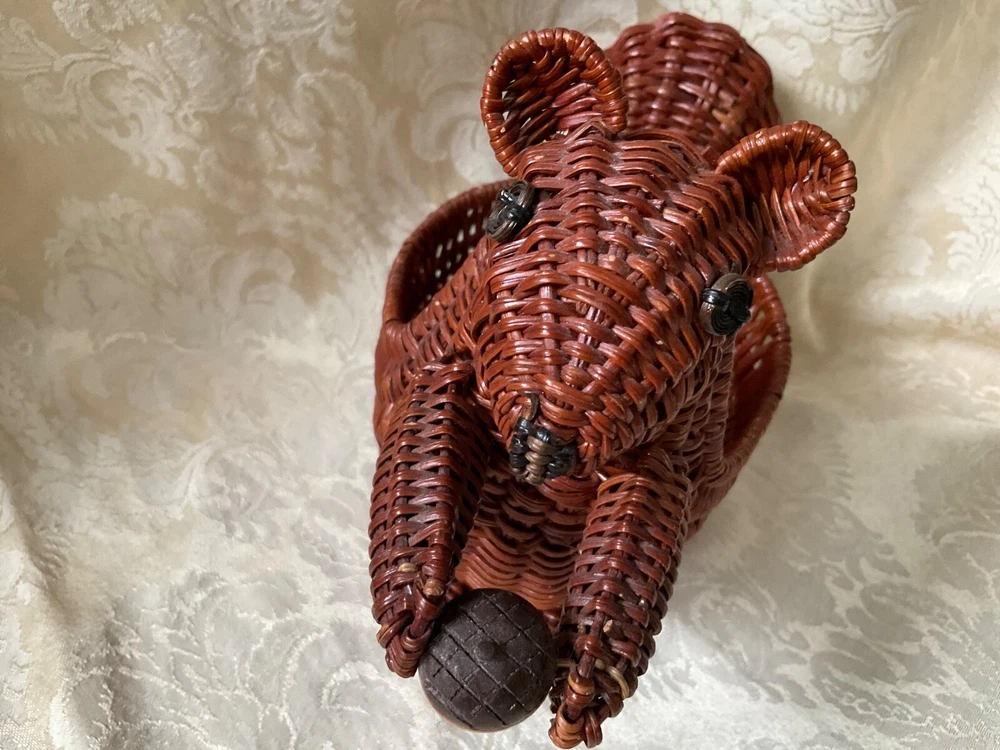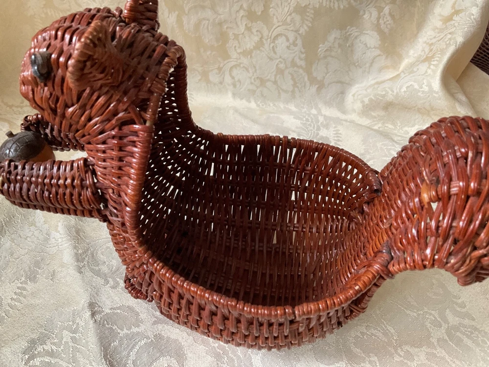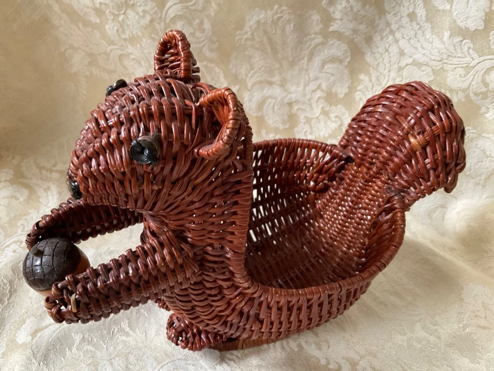 Vintage Brown Woven Wicker Squirrel & Acorn Basket Candy Planter Trinket Dish Measures approx 9.5” paws to tail, 7” high