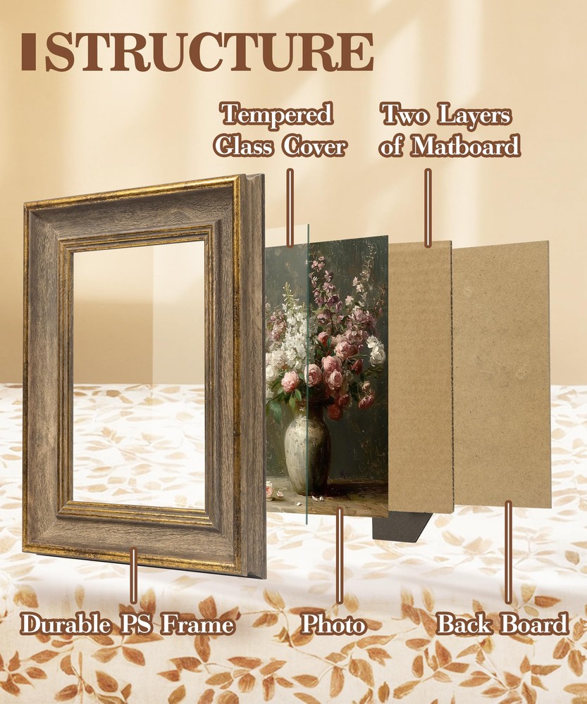 【Vintage Design】This vintage brown and gold distressed frame looks old and elegant. Suit for many home decor style such as antique, shabby chic, vintage, modern and so on 【Multifunctinal Display】 Our 5x7 picture frame can be displayed independently or mounted on the wall, either vertically or horizontally 【Durable Quality】Made of high-quality and sturdy PS frame, with shatterproof safety tempered glass front, ensure use for a long time 【Perfect Gift】A nice gift choice for family, friends, grandparents, mom, dad, on Mother's Day, Father's Day, Christmas, Thanksgiving and other holidays. Use photo frame to record your precious memories 【Order with Confidence】is committed to your satisfaction. Our dedicated after-sales support ensures any concerns are promptly addressed if your item arrives damaged