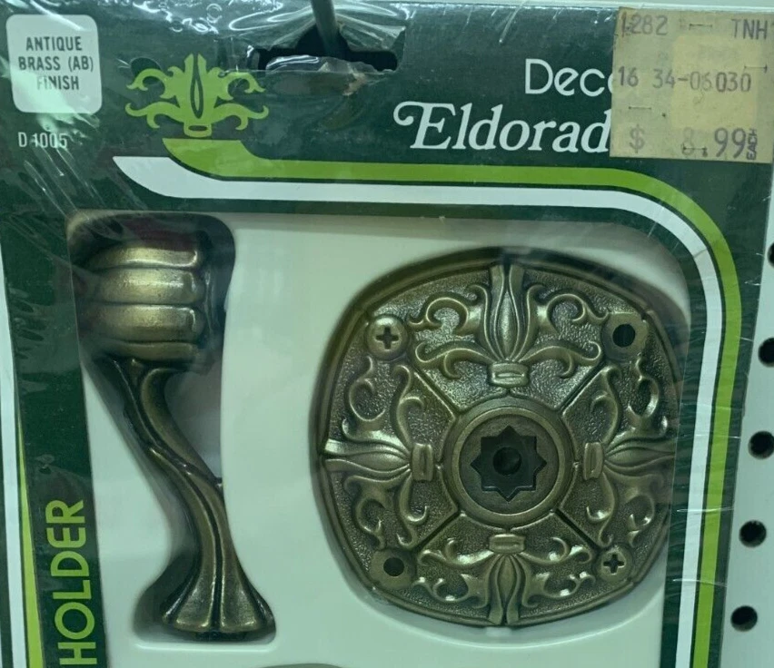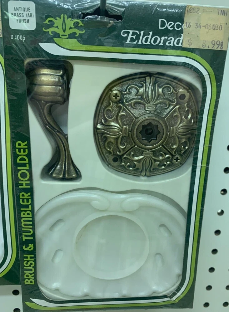Eldorado Brush & Tumbler Holder Antique Brass Finish Rare--Vintage This vintage new Eldorado Brush & Tumbler Holder is truely a rare find! You won't find this at any local store. This set is NEW from the mid-'80s and MADE IN THE USA. It comes from my family's hardware store that was closed approximately 1985. The inventory is just now being sold. Packaging may have slight shelf wear and some dust but the Brush & Tumbler Holder is in ideal condition. This is a rare find! They just don't make things like they used to. This is your chance to get a piece of the quality of the past. Thank You For Looking At Our Eldorado Brush & Tumbler Holder!