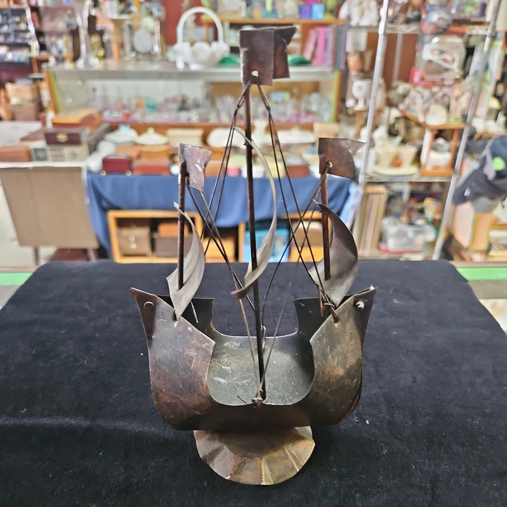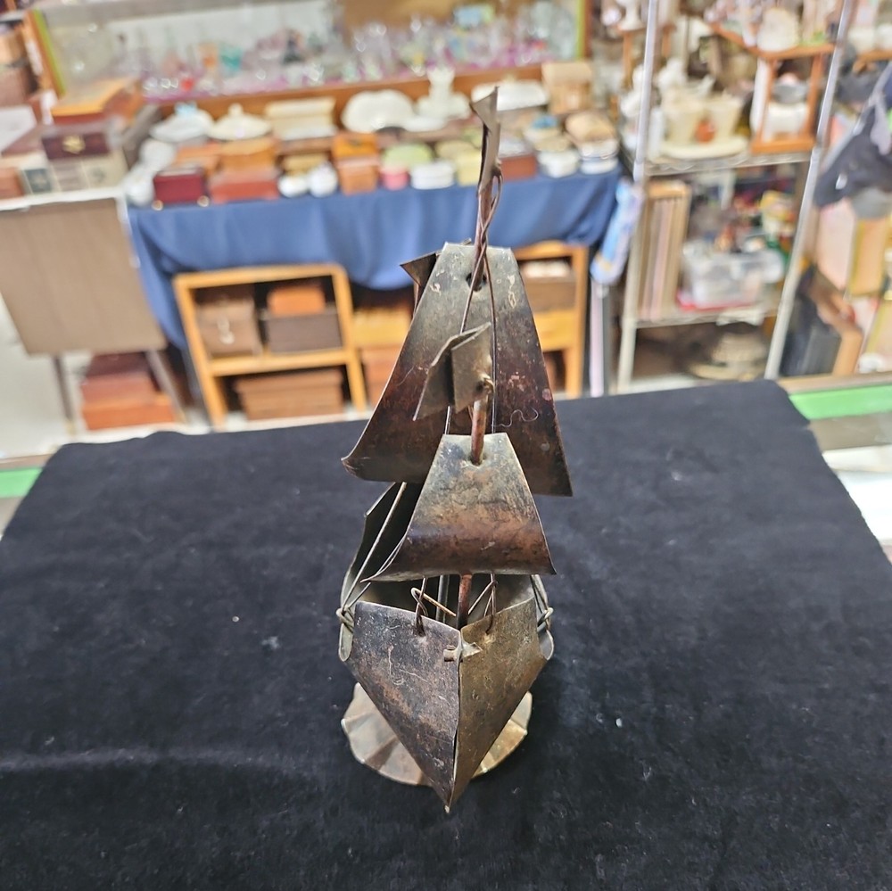 This vintage small Brutalist sailing ship metal art sculpture stands at 7.5 inches tall, making it a unique and eye-catching piece for any art lover. Handmade with a 3D production technique, this metalwork sculpture features a sailing ship as its subject, adding a nautical touch to any space. The Brutalist style gives it a rugged and modern aesthetic, perfect for those who appreciate minimalist and artistic decor.