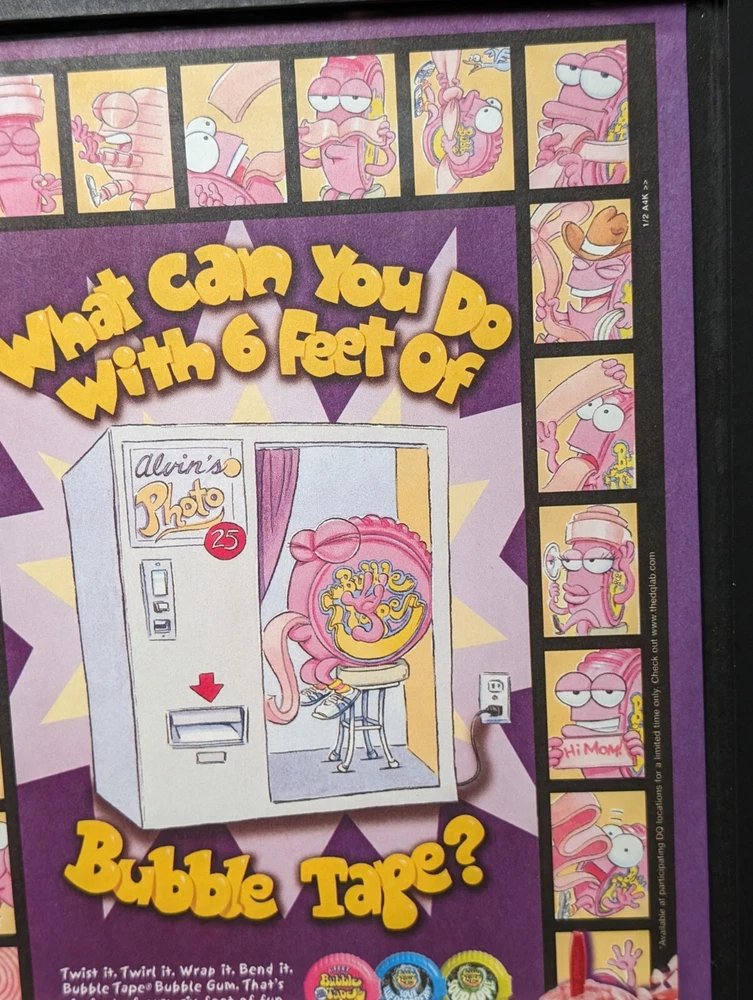 Frame is not included and is for display of advertisement. Measures roughly 6.5 x 10 inches. The ad can be centered or matted in any 8.5 x 11 inch frame for great a display This vintage Bubble Tape 2000s promo ad print poster art is a must-have for any collector. Featuring colorful graphics and this original piece is a great addition to any room or collection. Made in the United States, this poster is sure to impress and is in excellent condition. Perfect for fans of advertising and vintage collectibles, this original Bubble Tape poster is a rare find. Measuring 6.5/10in, this poster is an authentic piece of advertising history that is sure to delight. Don't miss out on the chance to own a piece of nostalgia, get your hands on this original Bubble Tape poster today!