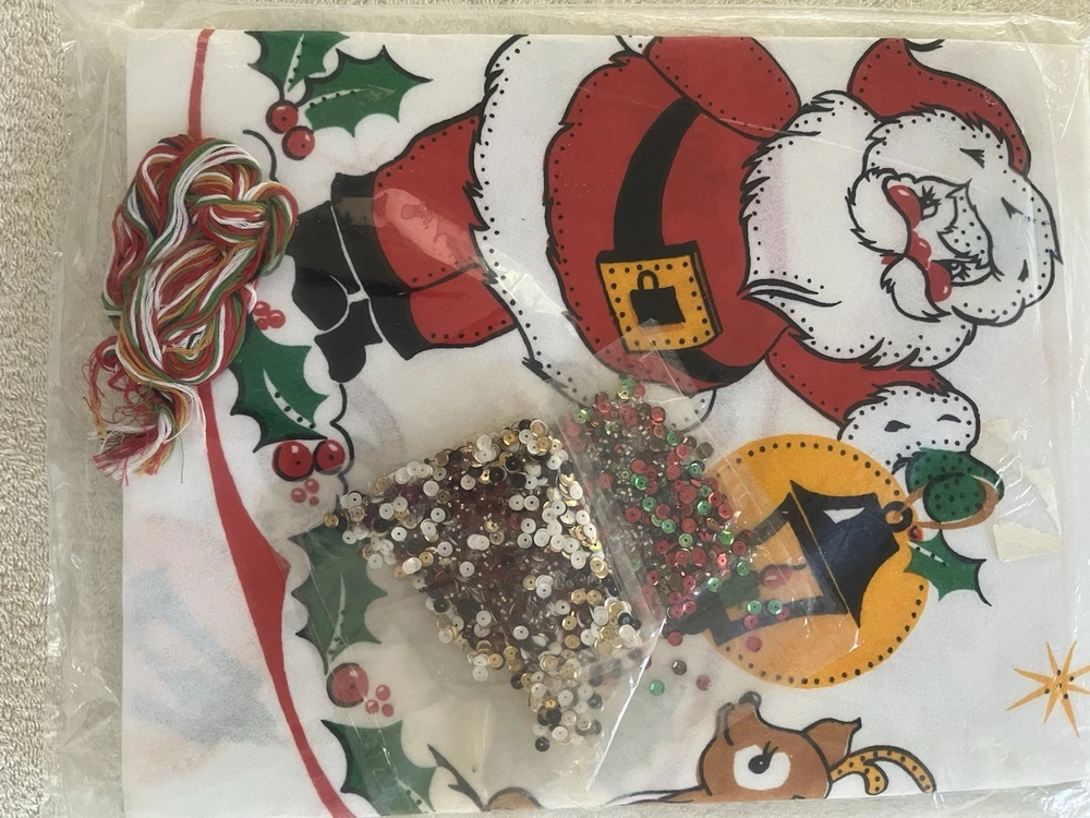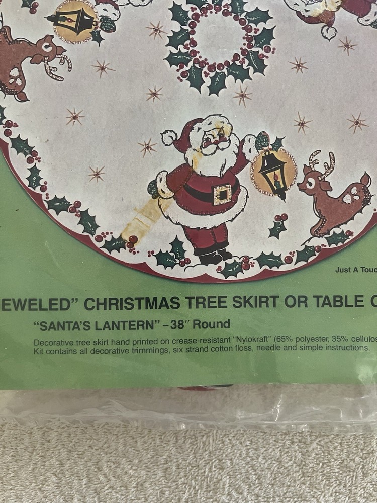 Vintage Bucilla Christmas Needlecraft “Jeweled” Christmas Tree Skirt or Table Center “Santa’s Lantern” 38 inches round. Kit is in perfect, unopened condition. There is no fading or tears, just a beautiful scene with Santa and a Reindeer painted on Nylocraft. Only requires a few well placed beads. Nylocraft is proprietary to Bucilla and is really fun to work with. Great kit for Bucilla collectors, too. The colors make this a real standout decoration. Please see photos. Pet and smoke free home. No returns accepted.