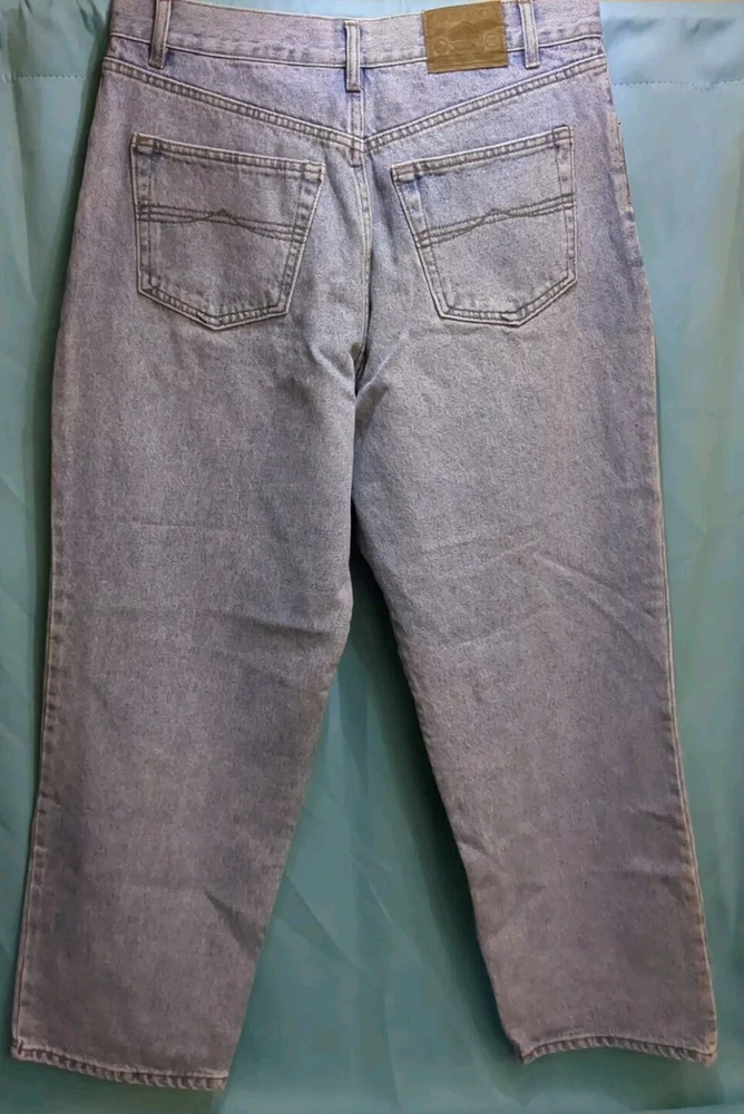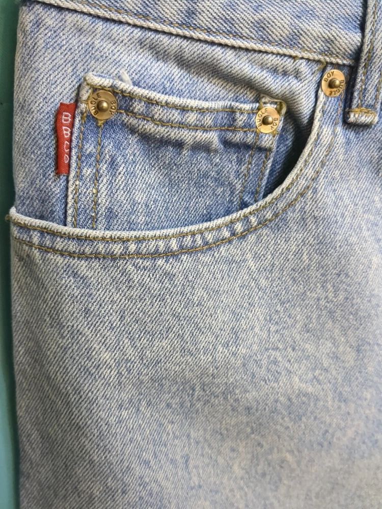 Elevate your denim game with these vintage Bugle Boy jeans in a light wash. The classic fit and wide-leg style make them perfect for any occasion, while the 34-inch waist size and 32-inch inseam ensure a comfortable fit for men. The fabric is made of high-quality denim and features a grunge-inspired 90s hip hop theme, making them a must-have for any fashion-forward individual. These jeans are perfect for those looking for a unique addition to their wardrobe and are sure to turn heads.