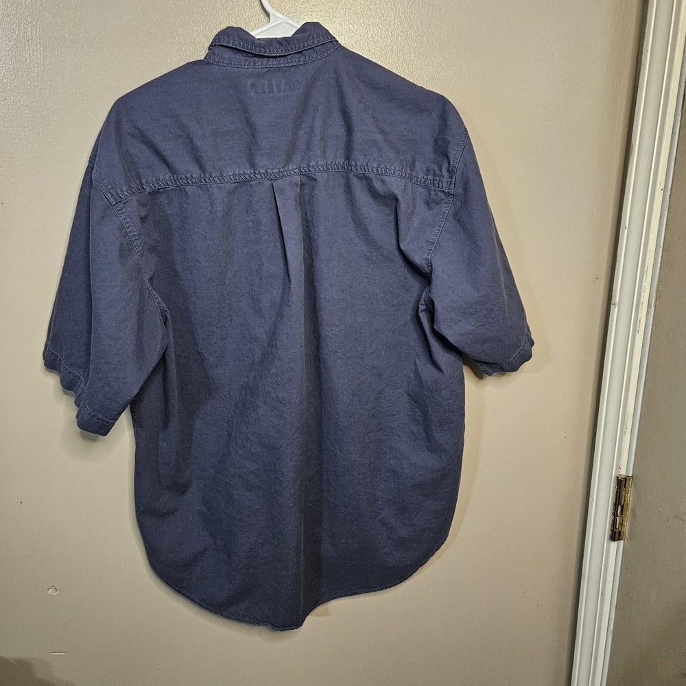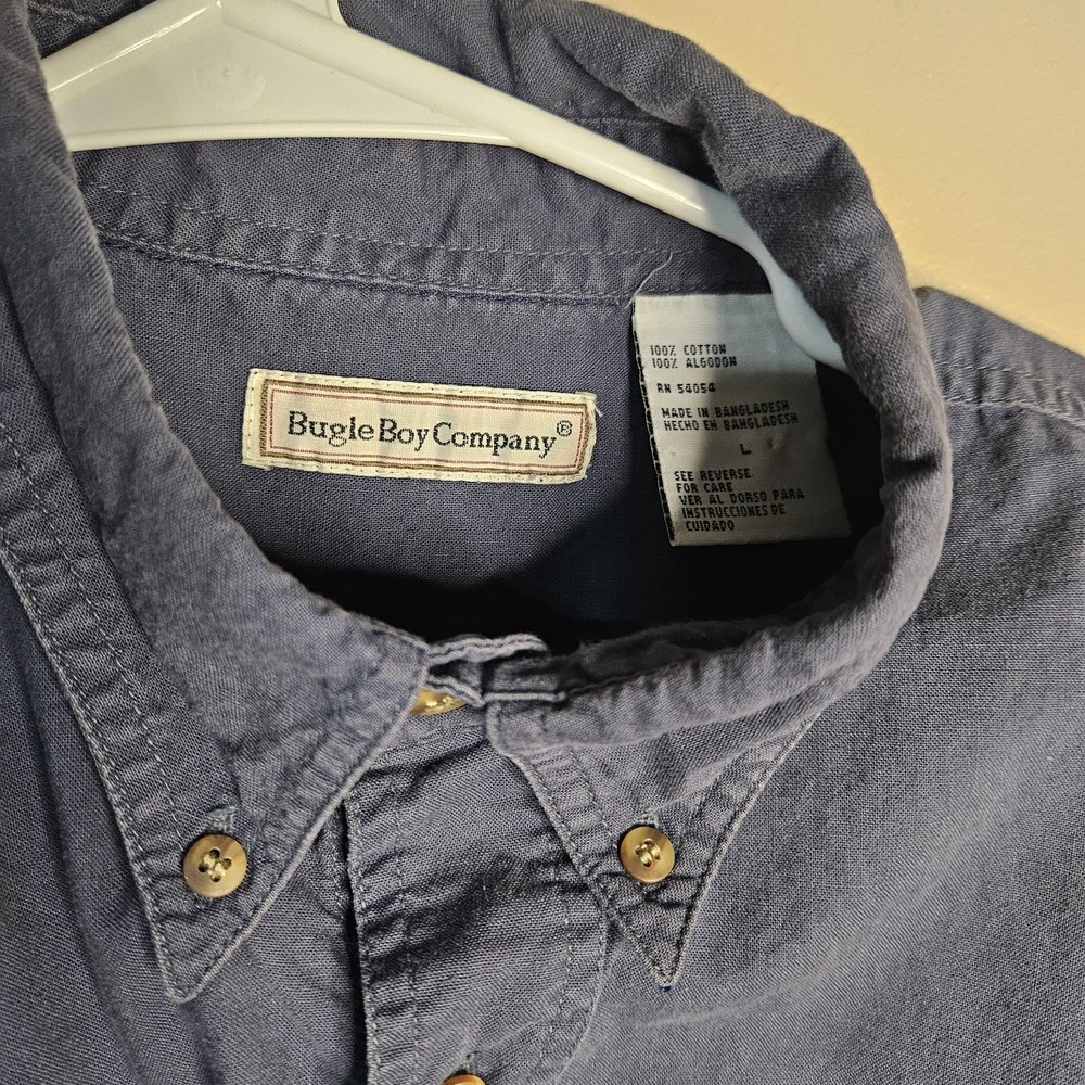 The Vintage Bugle Boy Men's Blue Collar Polo Shirt is a classic piece from the 90s with a short sleeve design and collared neckline. Made from comfortable cotton material, this casual polo shirt features a button accent and is perfect for the summer, fall, and spring seasons. The regular fit and size Large make it a versatile and stylish addition to any man's wardrobe. Machine washable and with the vintage brand Bugle Boy, this polo shirt offers a timeless and retro look for any occasion.